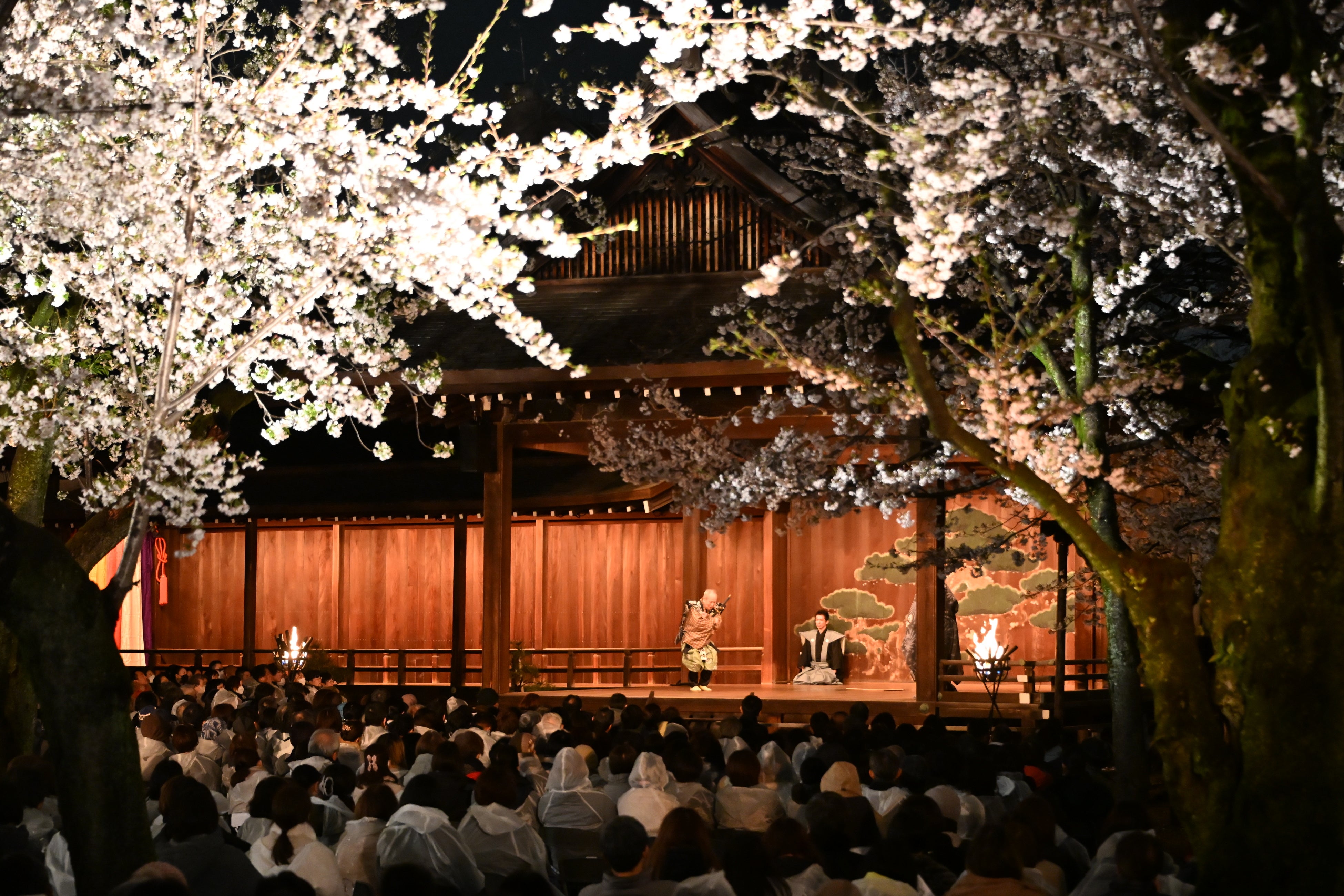 東京最古といわれる靖國神社の能楽堂で行われるのは「奉納夜桜能」。当代きっての能楽師、狂言師によって披露される贅沢な演能と美しい夜桜の共演を楽しむことができます。