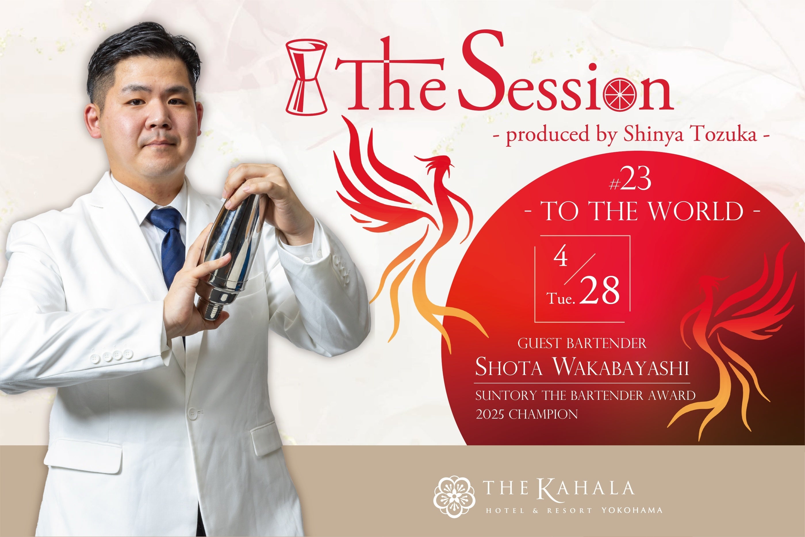 著名なトップバーテンダーを迎えて開催する1日限りのコラボレーションイベント「The Session」。第23弾となる今回は、2025年に開催された日本を代表するカクテルコンペティションの一つ「サントリー ザ・バーテンダーアワード2025」で優勝を果たした、若林 将太氏をゲストバーテンダーにお迎えします。若林氏は、卓越した技術と豊かな表現力で注目を集める若手バーテンダー。同大会では、五大ウイスキーの個性を調和させたSUNTORY WHISKY「碧Ao」をベースに、日本の春を象徴する桜の香りと世界各国の茶葉のニュアンスを重ねたカクテル「鳳鳴(ほうめい)」で見事優勝に輝きました。今回は、同大会での優勝カクテル「鳳鳴」をはじめ、SUNTORY WHISKY「碧Ao」をベースに、本イベントのために特別に考案されたスペシャルカクテルなど、計4種をご提供。世界を目指すバーテンダーの感性と技術を間近に体験いただける、1日限りの特別なひとときをお届けいたします。