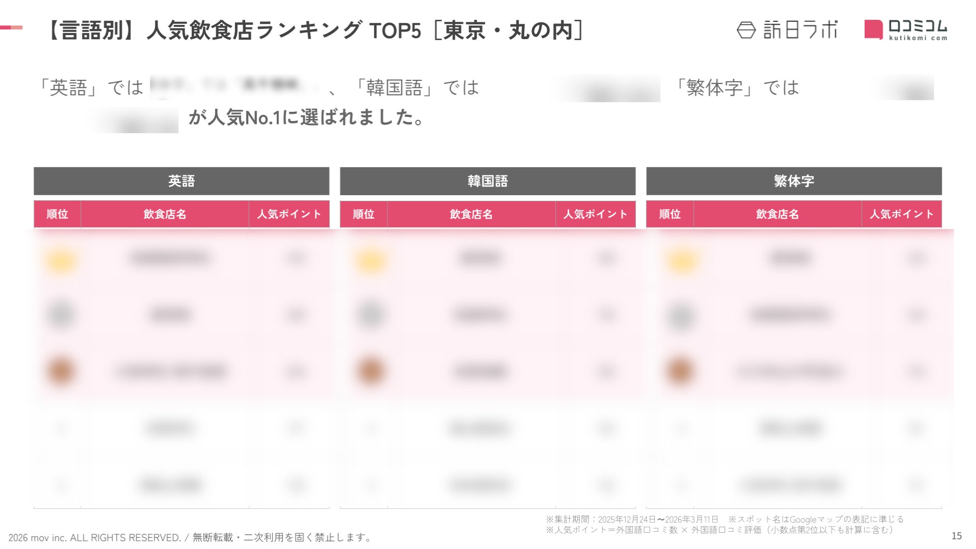 業界最大級のインバウンドビジネスメディア「訪日ラボ」及び 店舗向け集客一元化プラットフォーム「口コミコム」を運営する株式会社mov(代表取締役:渡邊 誠、本社:東京都渋谷区、以下mov)は、東京・丸の内エリアの飲食店に寄せられた最新の口コミデータから、独自の『インバウンド人気飲食店ランキング』を発表しました。