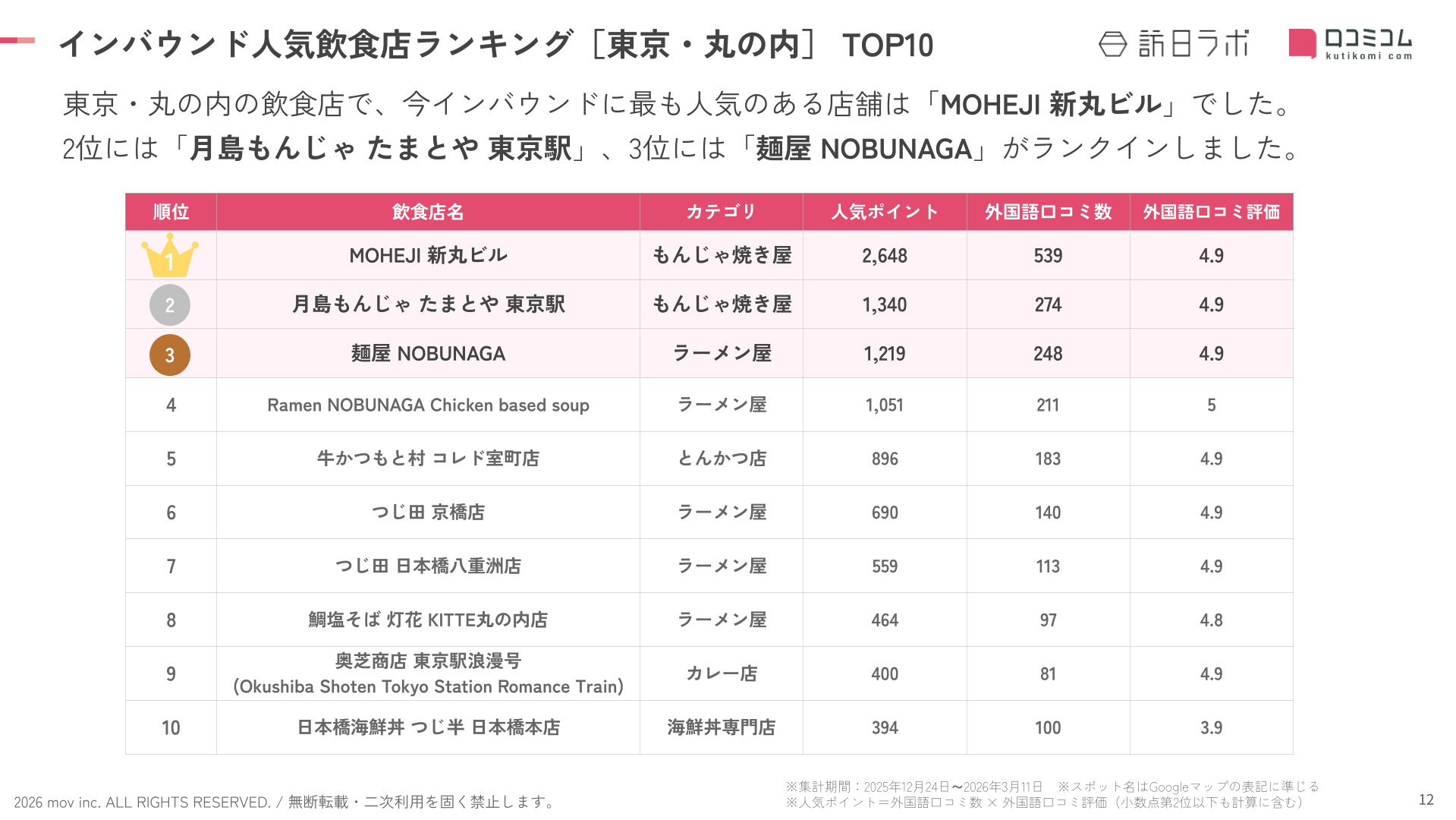 業界最大級のインバウンドビジネスメディア「訪日ラボ」及び 店舗向け集客一元化プラットフォーム「口コミコム」を運営する株式会社mov(代表取締役:渡邊 誠、本社:東京都渋谷区、以下mov)は、東京・丸の内エリアの飲食店に寄せられた最新の口コミデータから、独自の『インバウンド人気飲食店ランキング』を発表しました。