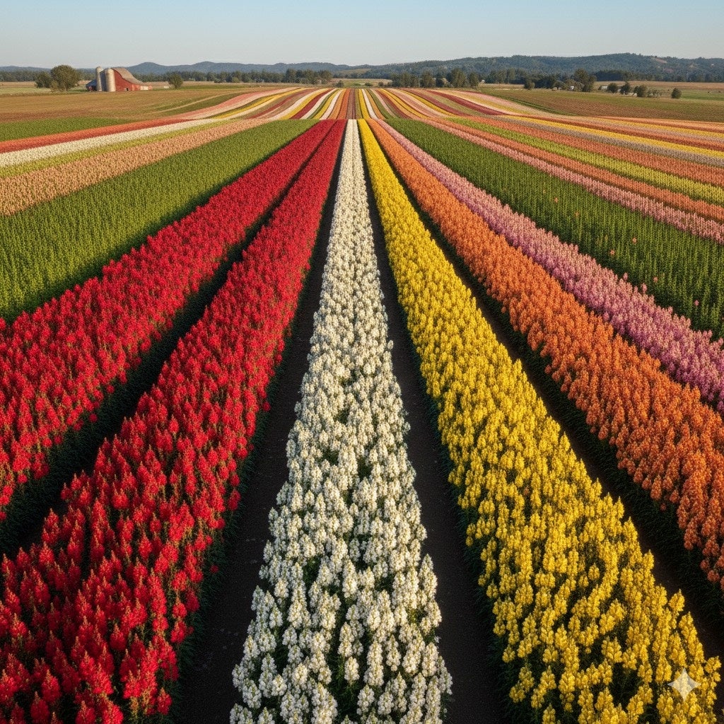 「いろどりの丘」を登り切った先に現れる広大な新農地では、キンギョソウが圧巻のスケールで開花します。