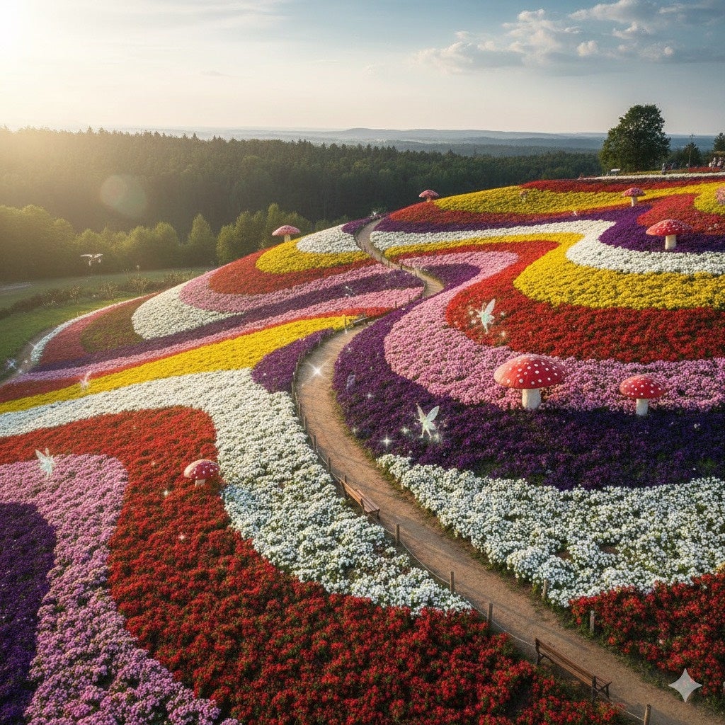 特徴: 丘の斜面を活かした植栽により、まるで色とりどりのドレスを広げたような立体的な景観が楽し