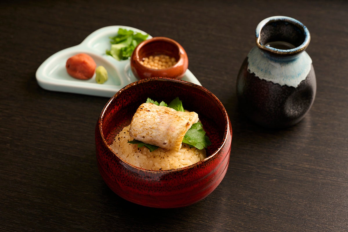【締】焼きおにぎりの特製ごま出汁茶漬け: 香ばしく炙ったのどぐろを、濃厚なごま出汁で。最後の一滴まで北陸の海の幸を堪能。
