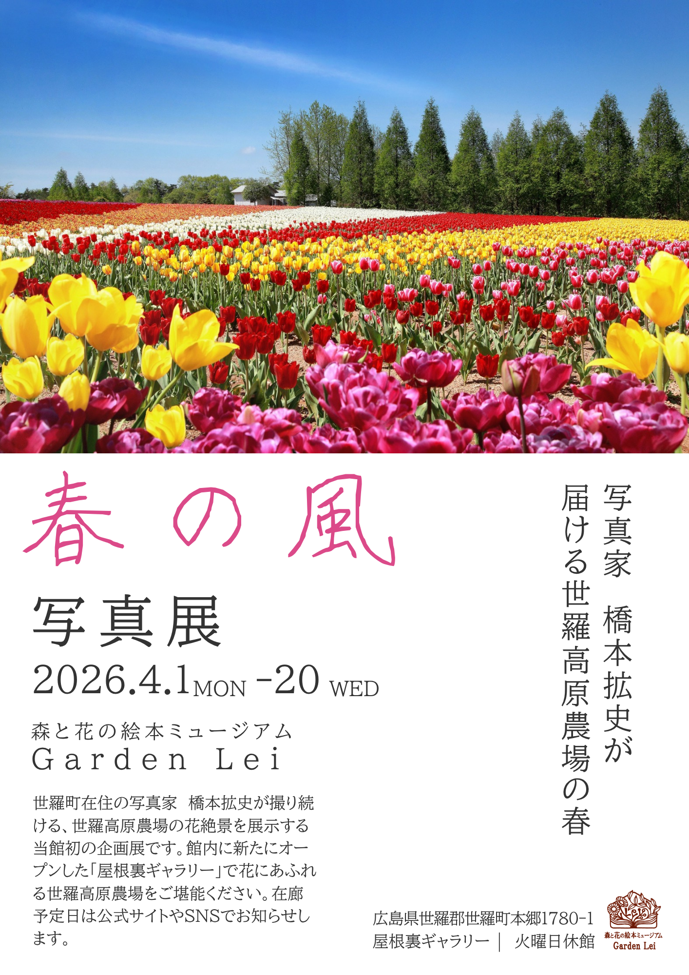 広島県世羅町「森と花の絵本ミュージアムGardenLei」は、冬季休館が明け2026年3月25日(水)から営業を再開しています。ミュージアム本館2階に新たにギャラリーを新設し、今後はアーティスト作品の展示など企画展を開催します。初の企画展は地元世羅町の写真家、橋本拡史さんによる写真展を開催します。