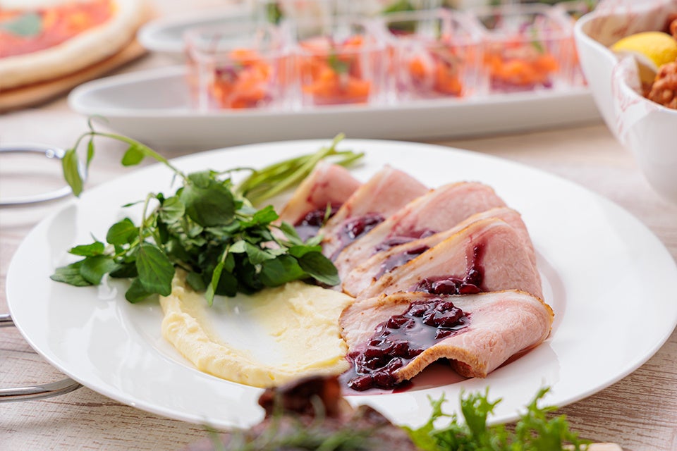 甘酸っぱいベリーソースがよく合うローストポークをはじめ、鰆・海老・あさりなど魚介の旨みあふれる香りがふわりと漂うシーフードのフィルム包み、トマトの風味とスパイスが絶妙にマッチしたトマトチキンカレーなど、バラエティ豊かなお料理をご用意しております。また、ミニハンバーガーピザミニアメリカンドッグポテトフライチキンのから揚げなど、お子さまに人気のメニューも充実。デザートにはなみなみのチョコレートが噴水のように溢れるチョコレートファウンテンもお楽しみいただけます。さらに、5月5日のこどもの日には、柏餅も登場いたします。