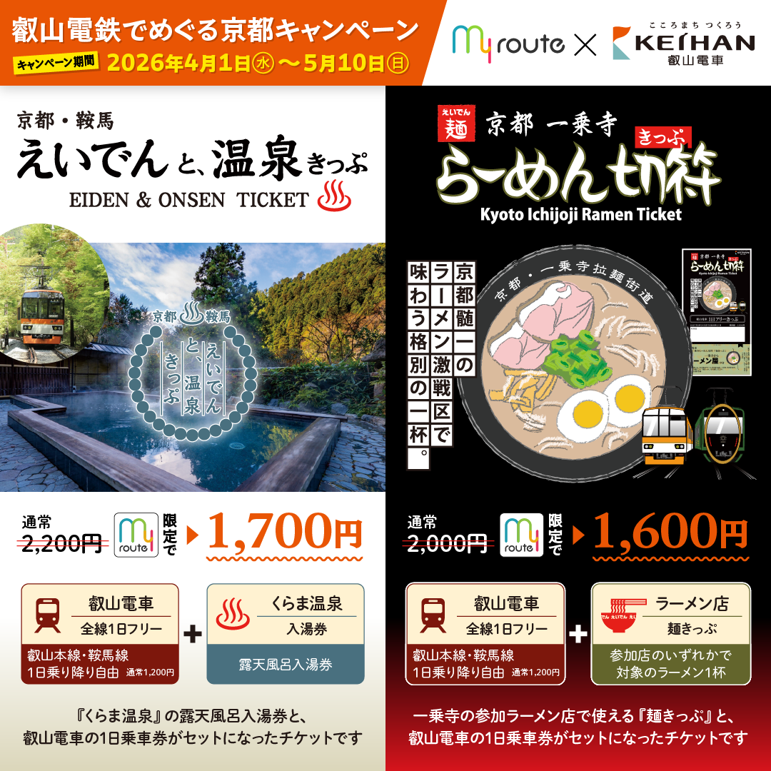 本キャンペーンでは、叡山電鉄沿線の人気観光スポットである鞍馬・貴船エリアや、京都屈指のラーメン激戦区として知られる一乗寺エリアをお得に巡ることができるデジタル乗車券を、my route限定の特別価格で期間限定販売します。