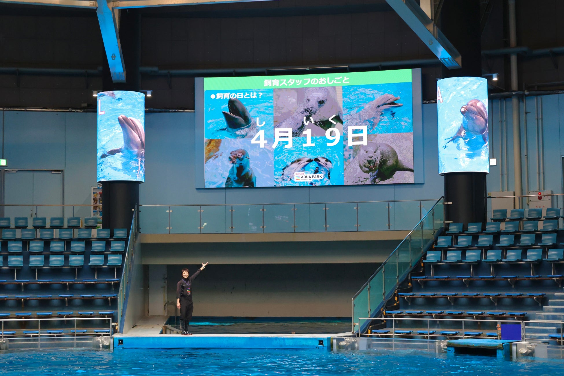 飼育スタッフの仕事の基盤となる“調餌・掃除・給餌”の3つの“じ”をはじめ、動物たちの健康や環境を守るための取り組み、イルカたちと向き合ううえで大切にしている考え方にも触れながら、その魅力を分かりやすくお伝えします。さらに、大型LEDビジョンを活用したクイズ形式の解説を通して、パフォーマンスの背景や飼育スタッフの仕事への理解を深め、いつもとは少し違った視点で水族館を楽しむきっかけを提供します。