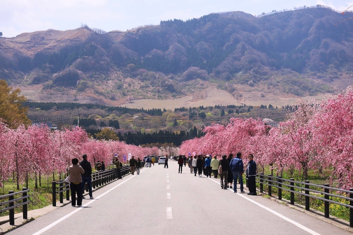 阿蘇五岳のひとつ「根子岳」を背景に、約500mにわたりしだれ桜が直線道路の両側に咲き連なる桜並木。同時期には菜の花も見頃を迎え、春色の花々と雄大な山の景観が織りなす美しい風景を楽しめます。