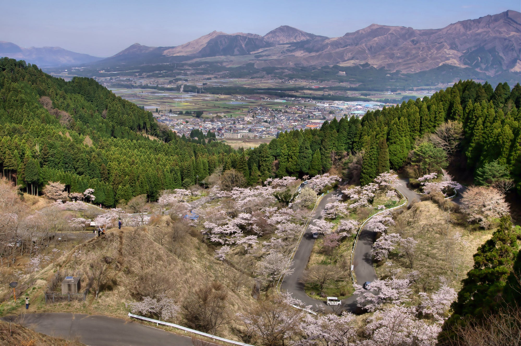 高森町から高千穂方面へ向かう国道の横にひっそりとある道、通称「九十九曲がり」。春になると、ソメイヨシノやヤマザクラなど約7,000本の桜が道沿いを彩り、一帯は淡い桜色に包まれます。展望地点からは阿蘇の山々を望む雄大な絶景と合わせてお花見を楽しむことができます。