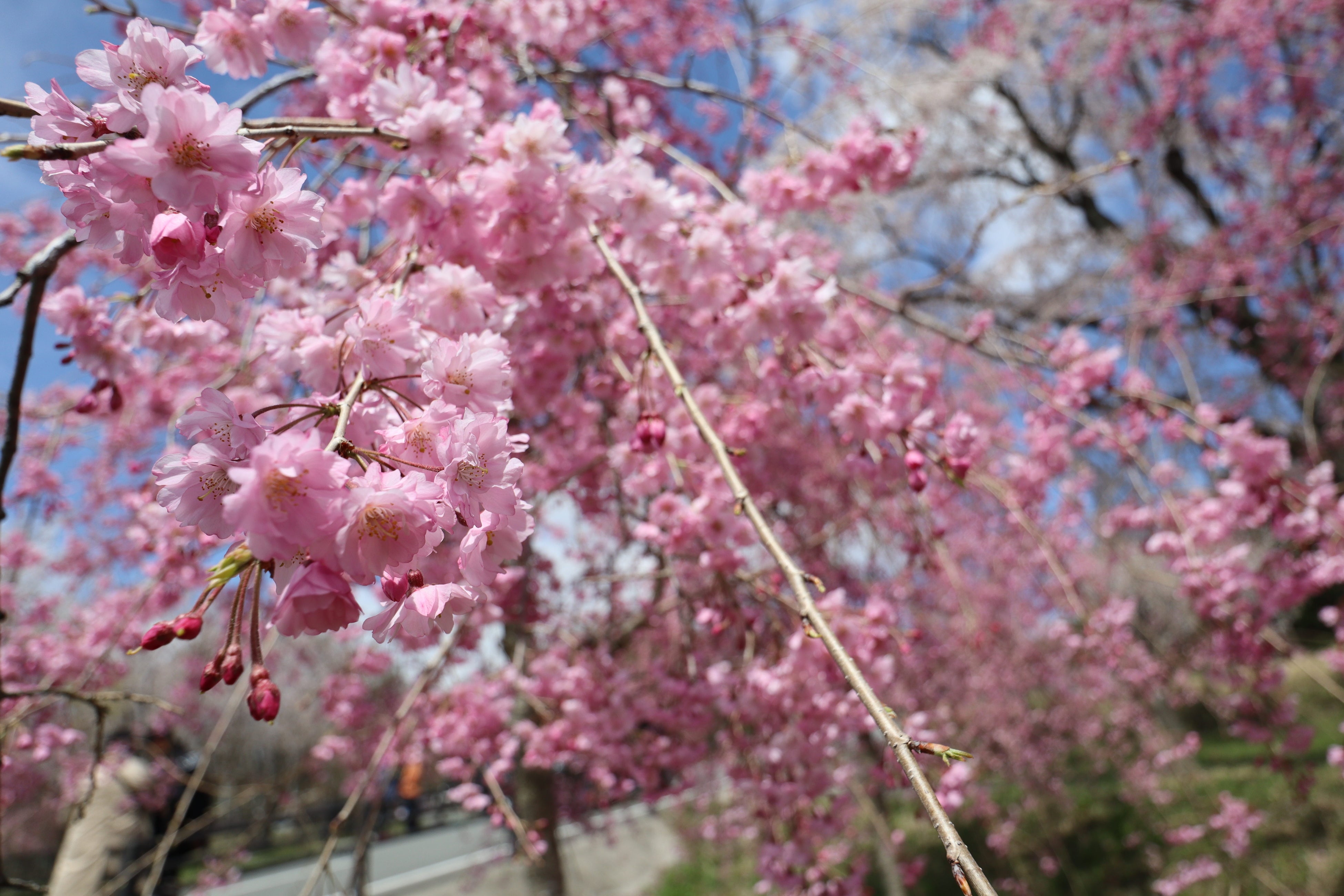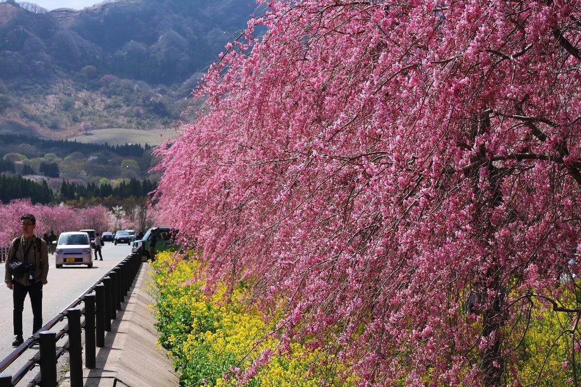 阿蘇五岳のひとつ「根子岳」を背景に、約500mにわたりしだれ桜が直線道路の両側に咲き連なる桜並木。同時期には菜の花も見頃を迎え、春色の花々と雄大な山の景観が織りなす美しい風景を楽しめます。