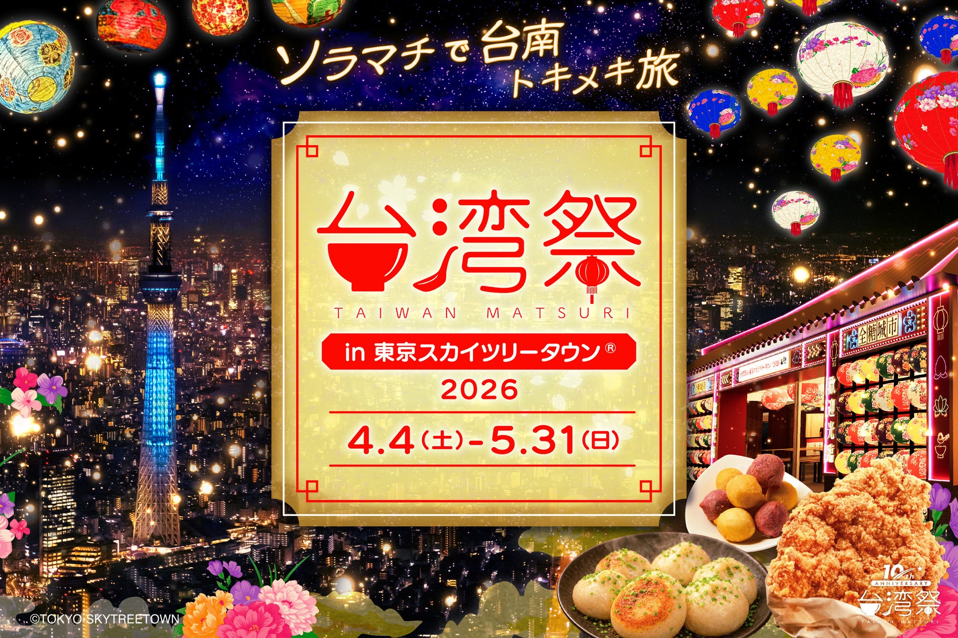 「台湾祭in東京スカイツリータウン(R) 2026-台南ランタン祭-」を4月4日(土)~5月31日(日)の期間で開催します。GWの人気イベントととしてすっかり定着した台湾祭。おなじみの「大鶏排」に、「小籠包」などの絶品台湾グルメに加え、「台南担仔麺(タイナンタンツーミェン)」や「台南蝦仁飯(タイナンシャーレンファン)」など、台南ならではのグルメが登場。。