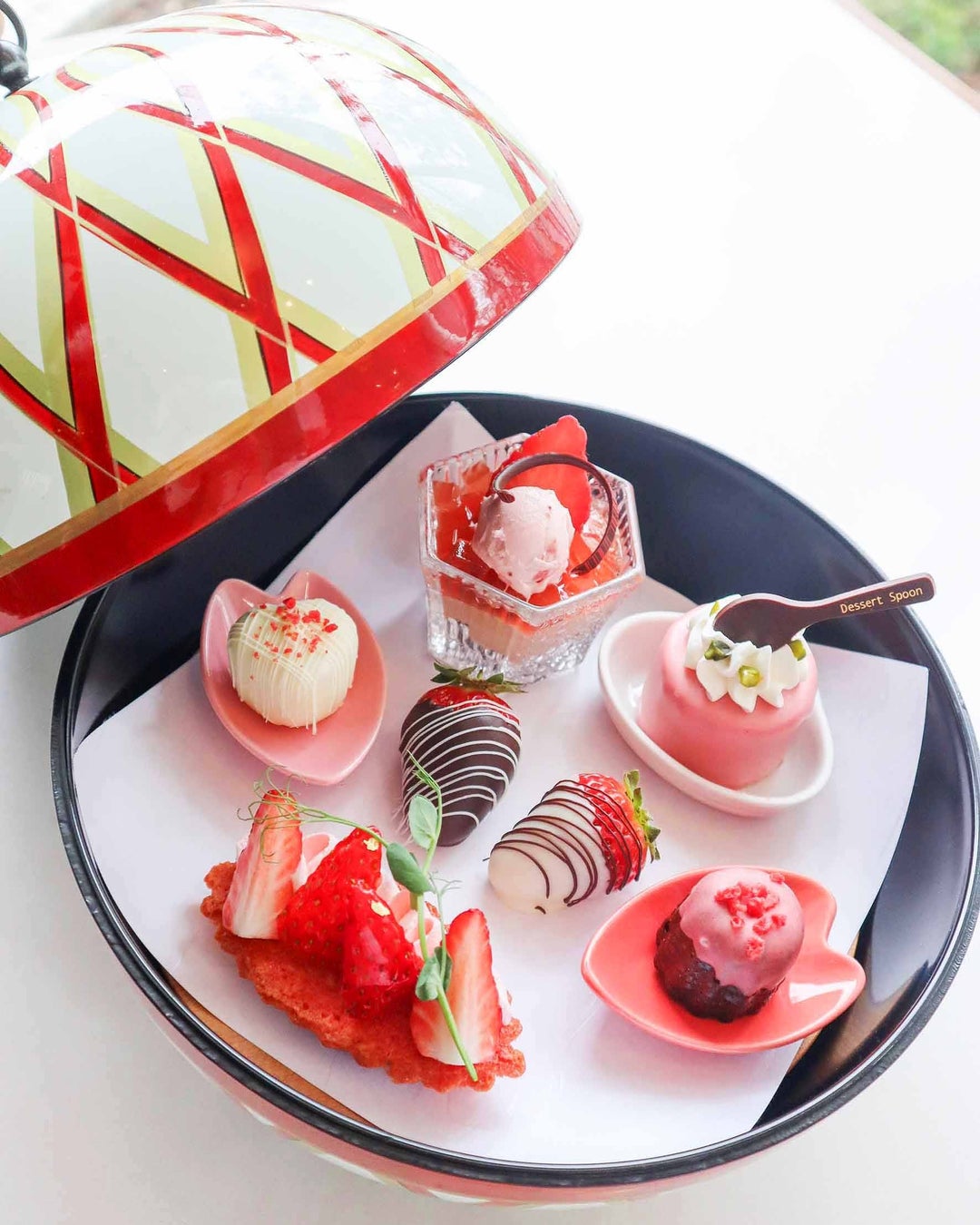 和歌山の伝統を感じさせる“紀州てまり”の蓋を開けると、和歌山県産ブランド苺「まりひめ」をはじめ、フィナンシェ、ムース、ボンボンショコラなど苺尽くしのスイーツが艶やかな赤のグラデーションを描き、一層華やかな世界へ。