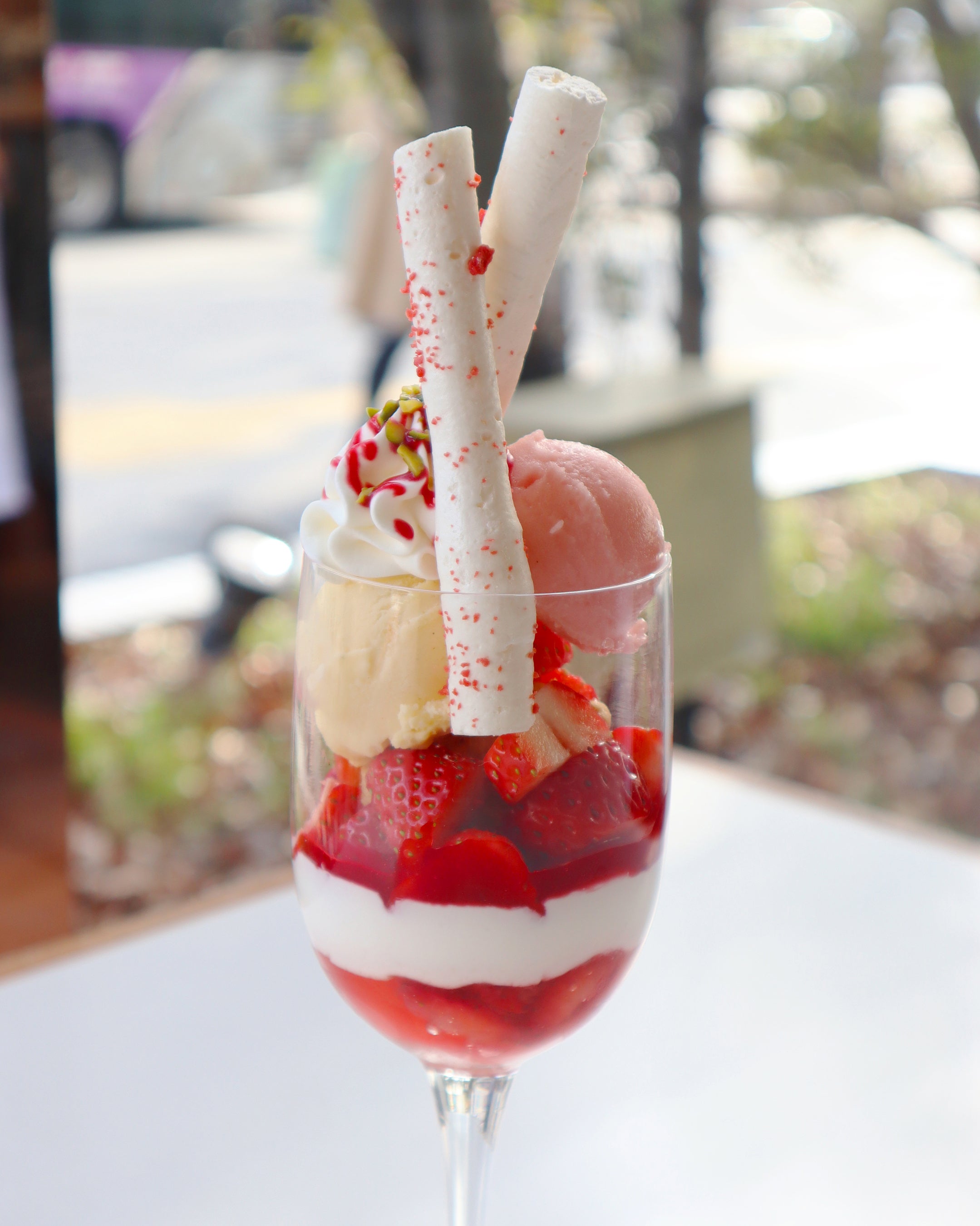 はじけるソーダにストロベリーシロップを重ね、トップにバニラアイスをトッピング。グラスの中で淡いピンクからクリアへグラデーションが広がり、ひと口ごとに “シュワッ” と甘酸っぱさが弾けます。