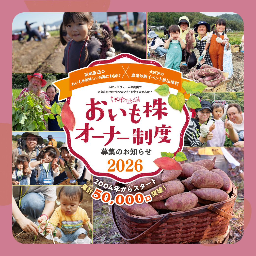 らぽっぽファームが2004年より取り組んでいる農業体験プログラムで、全国5カ所あるらぽっぽファームの畑からお好きな畑、さつまいもをお選びいただき、さつまいも畑のオーナーになっていただける制度です。オーナーになっていただいた方は、春の苗植会・秋の収穫祭にご参加いただくことができ(別途参加費)、ご自身の手で愛情たっぷりに育てたさつまいもを味わうことができます。5月より全国5カ所のらぽっぽファーム畑で開催されるさつまいも苗植会の参加募集が3月12日(木)よりスタートしました。ぜひ、大自然の中で自分のおいもの苗を植えてみませんか?毎年、家族連れを中心に人気を集める体験イベントです。苗植え・収穫に参加できなかったオーナー様のさつまいもは、各地のファーマーが大切に育てて、甘く熟成されたものを12月頃よりお届けいたします。