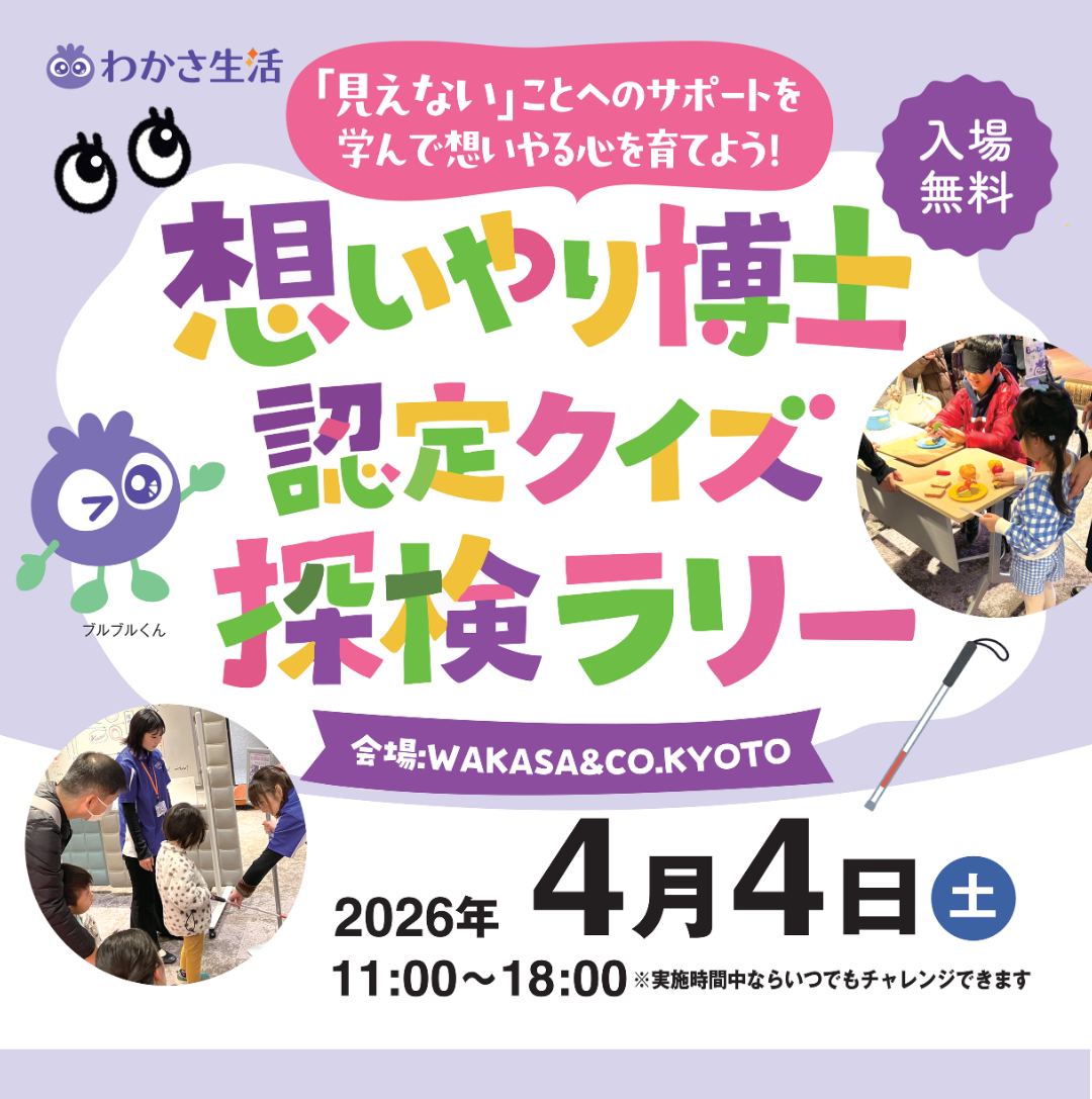 株式会社わかさ生活(本社:京都府京都市)は、視覚に関する理解を深める体験型イベント「想いやり博士 認定クイズ探検ラリー」を、2026年4月4日(土)にWAKASA&CO. 京都四条店にて開催いたします。本イベントは、子どもから大人まで楽しみながら「見えないことへのサポート」や“想いやりの心”を学べる参加型プログラムです。