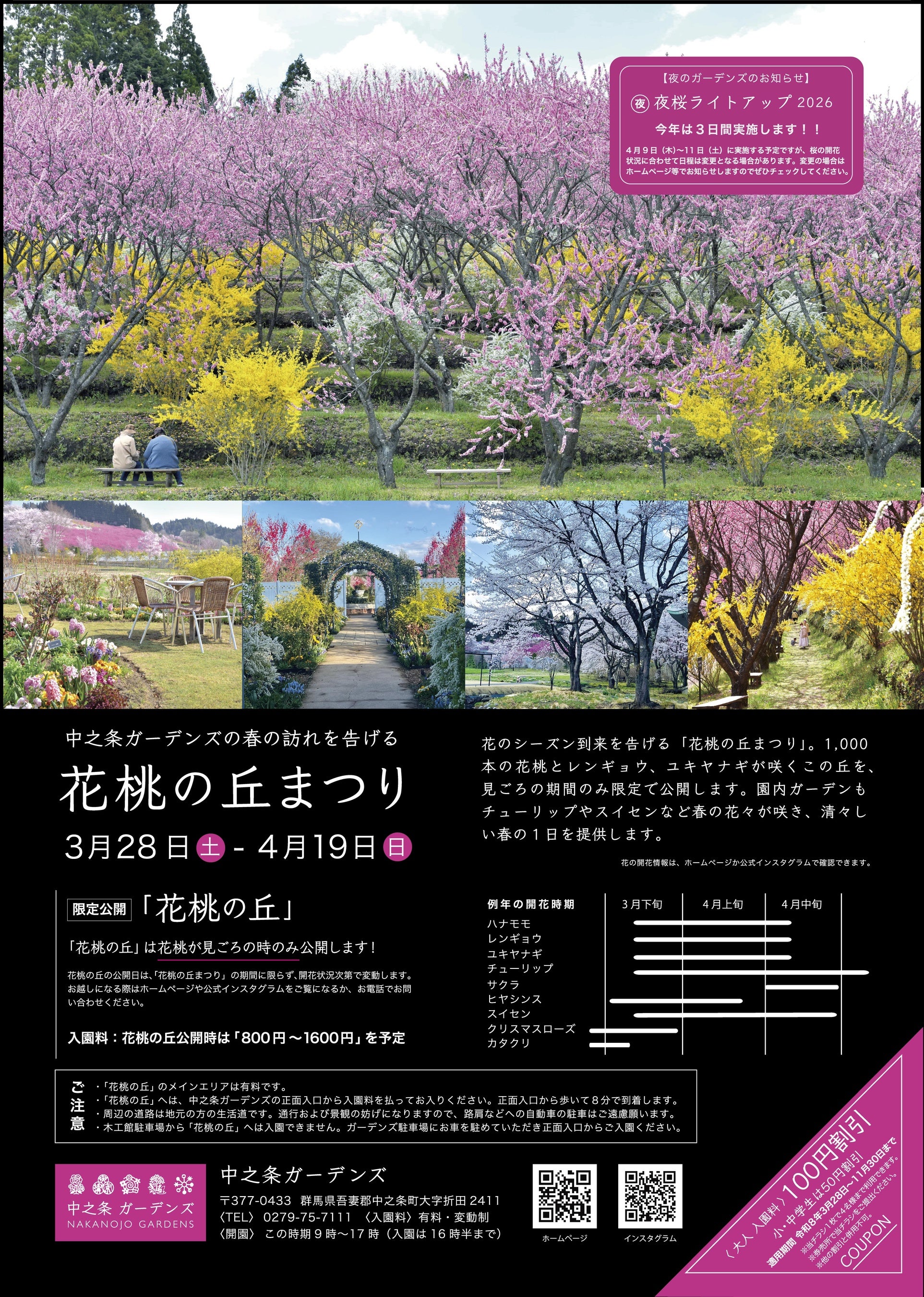 中之条ガーデンズ(群馬県中之条町)では、2026年3月28日(土)より、県内最大級約1,000本の花桃が咲き誇る「花桃の丘まつり」を開催します。
