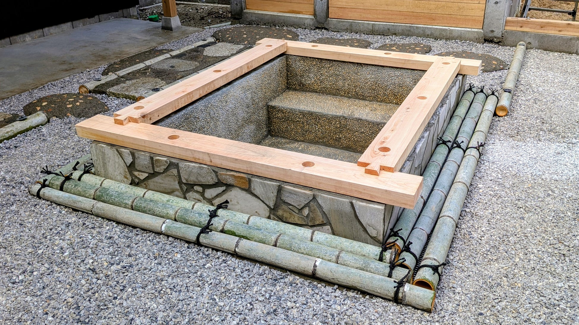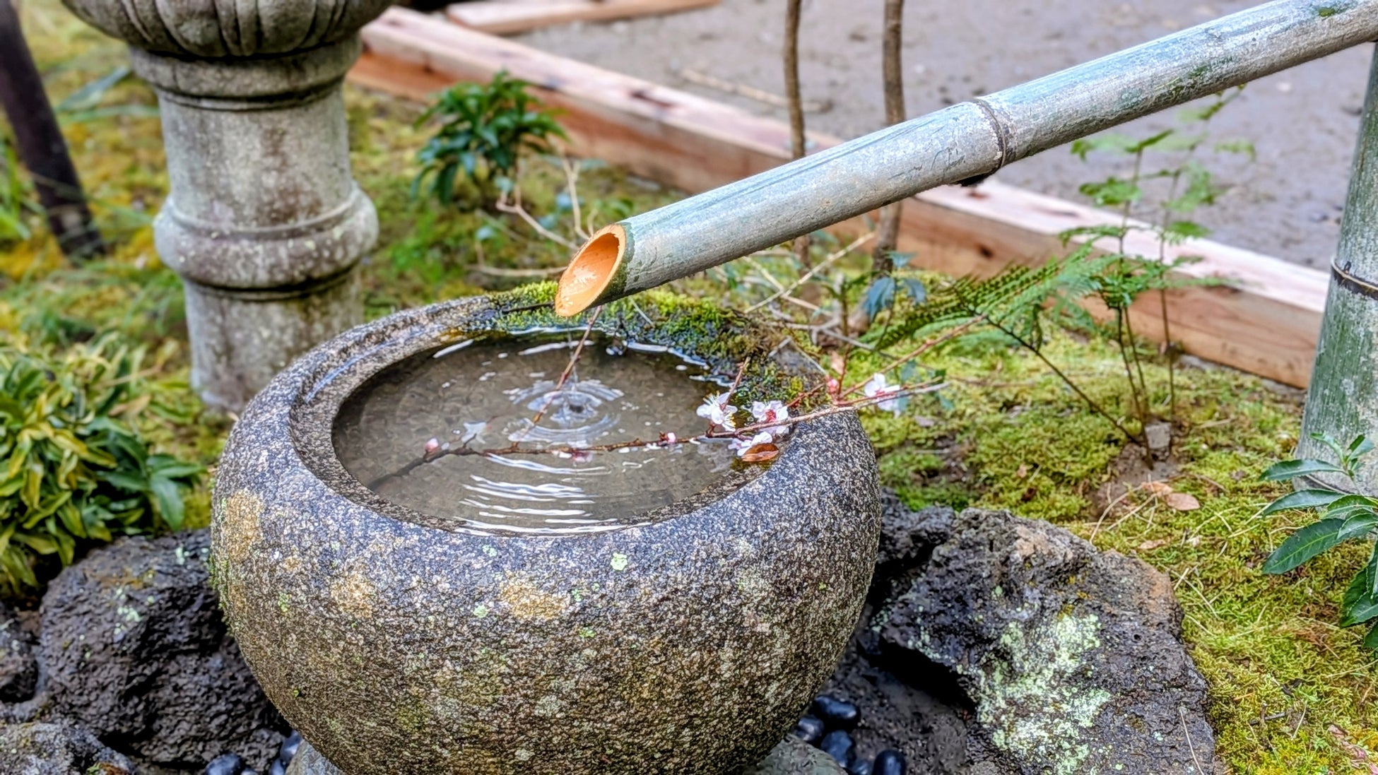 本庭園は、サウナ後の外気浴スペースとして設計されており、筧(かけい)、蹲(つくばい)、灯篭、延段、飛び石など、日本庭園の伝統的な要素を取り入れた空間となっています。
