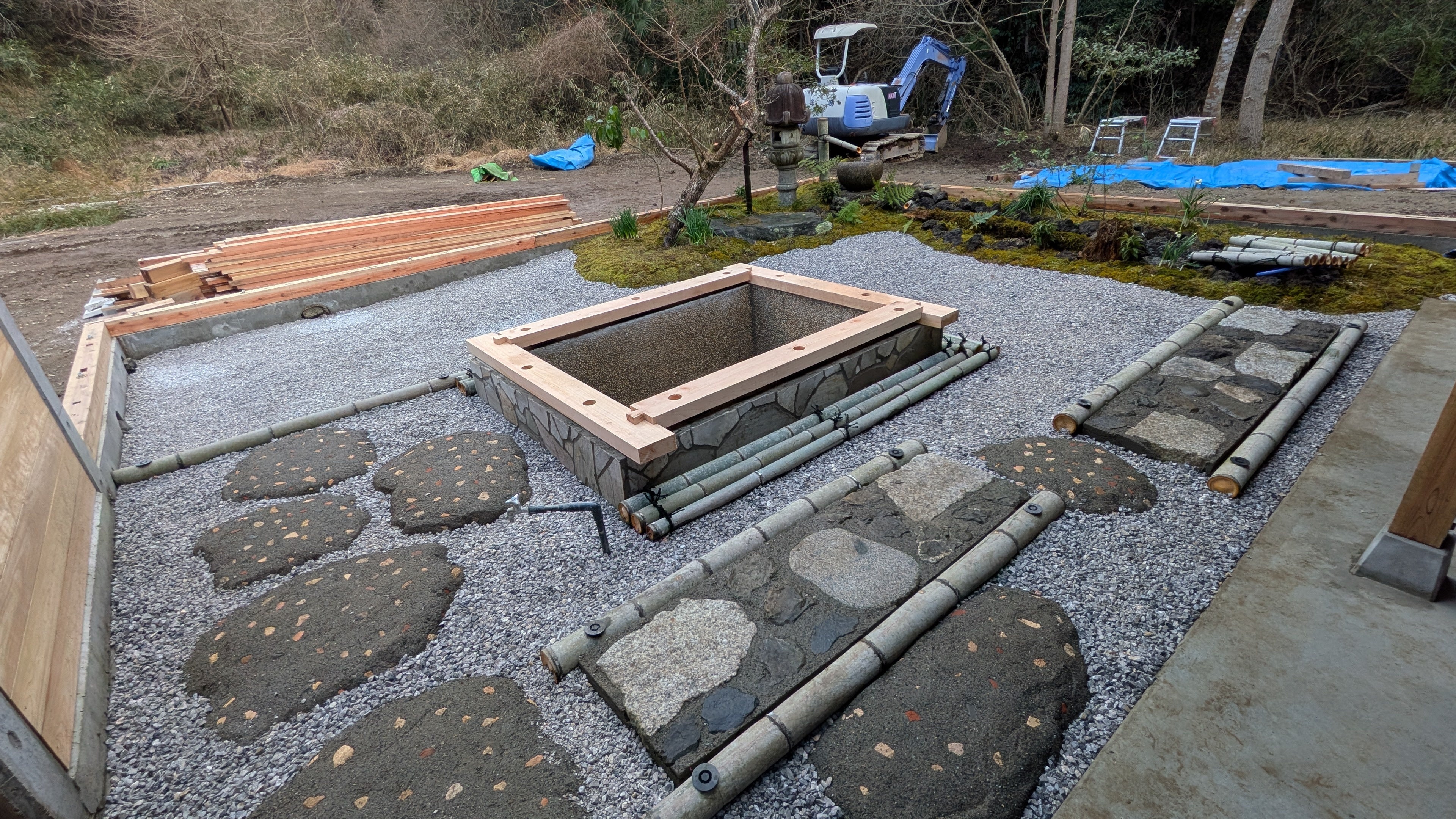 本庭園は、サウナ後の外気浴スペースとして設計されており、筧(かけい)、蹲(つくばい)、灯篭、延段、飛び石など、日本庭園の伝統的な要素を取り入れた空間となっています。
