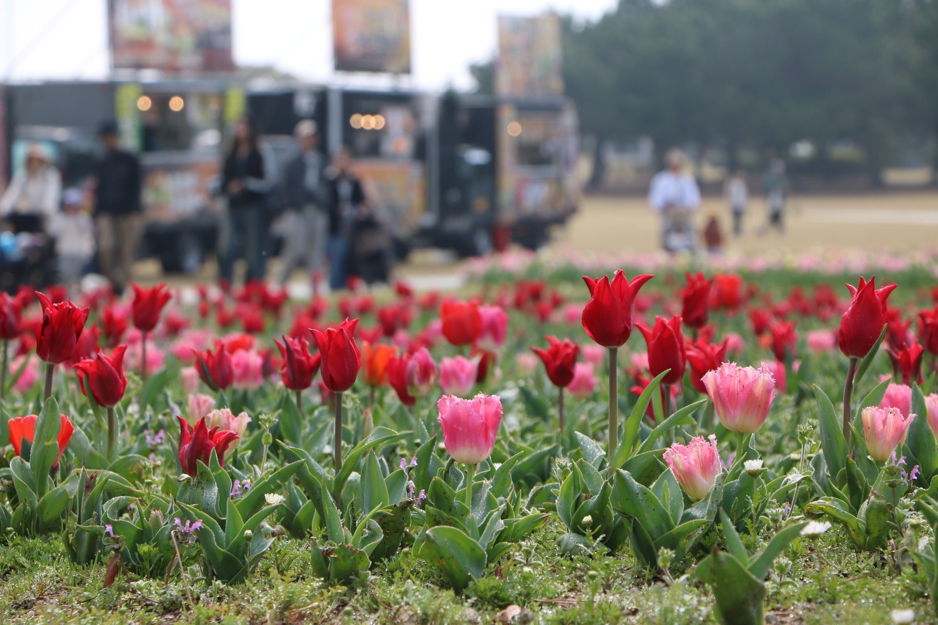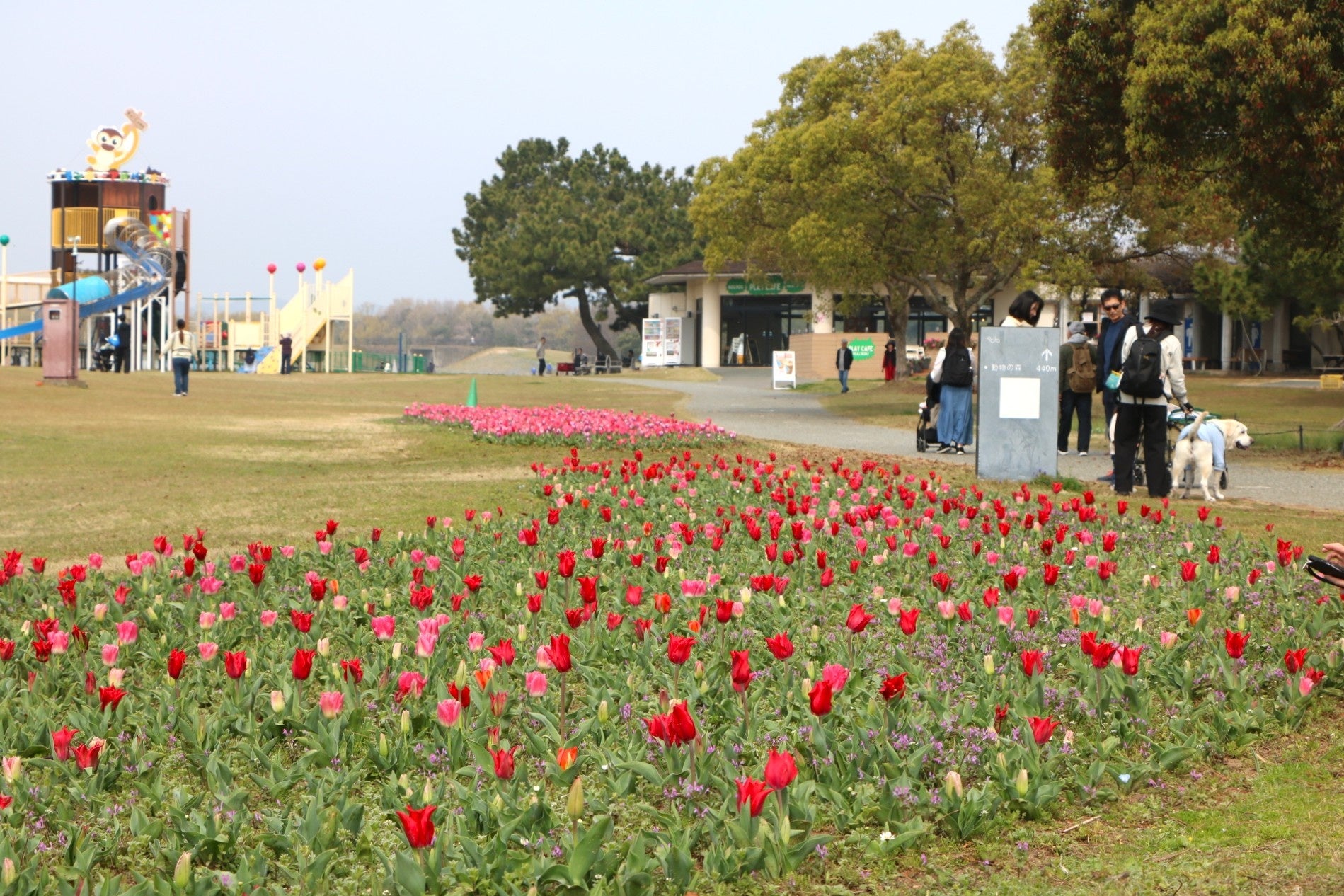 国営海の中道海浜公園(福岡県福岡市東区)の虹の花壇にて、チューリップが見頃を迎えました。4月中旬頃まで楽しめる見込みです。赤・黄・ピンク・白・紫など、40品種以上の色鮮やかなチューリップが咲き誇り、本格的な春の到来を演出しています。その美しい景観に、多くの来園者が写真撮影や散策を楽しんでいます。