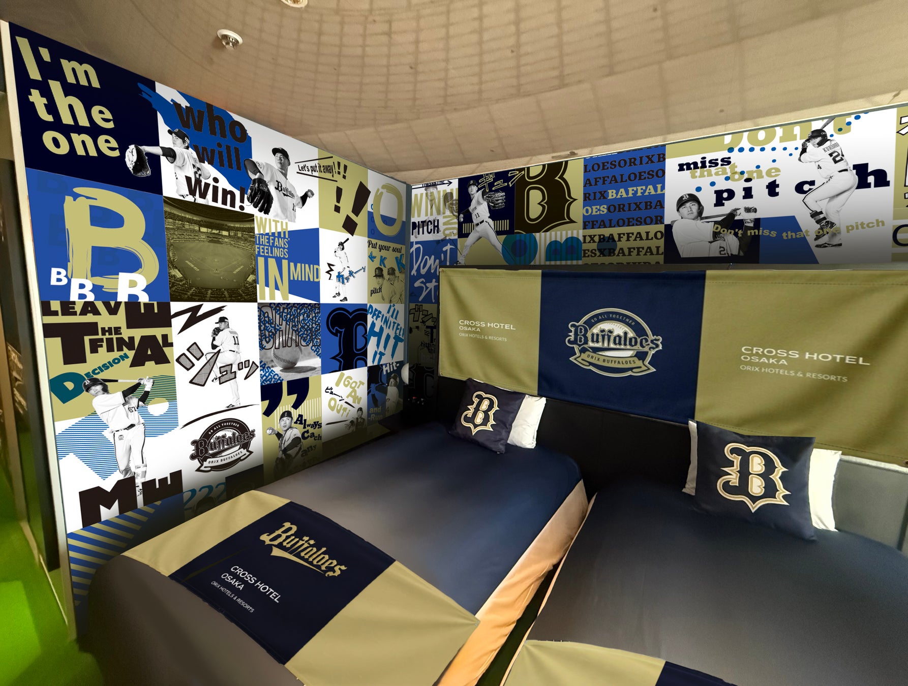 オリックス・バファローズコラボルーム「Bs ROOM」は2022年からスタートし、5年目を迎えました。客室全体でオリックス・バファローズを感じていただけるコラボルームです。昨年、クロスホテル大阪Instagram公式アカウントで理想の客室アイデアを募集するキャンペーン時にいただいたアイデアから「人工芝を敷き詰めた床」はそのままに、観客席からグラウンドを見ているような京セラドーム大阪のパノラマシートでまるで球場にいるような没入感を体験。また、躍動感あふれる選手画像を使用したストリートアート調のデザインが色々な角度からの異なるバファローズを表現しています。オリックス・バファローズファンには堪らない空間を提供します。熱い試合の余韻そのままに、クロスホテル大阪で「Bs ROOM 2026」にご宿泊いただき、推し選手に囲まれた特別なひとときをお楽しみください。