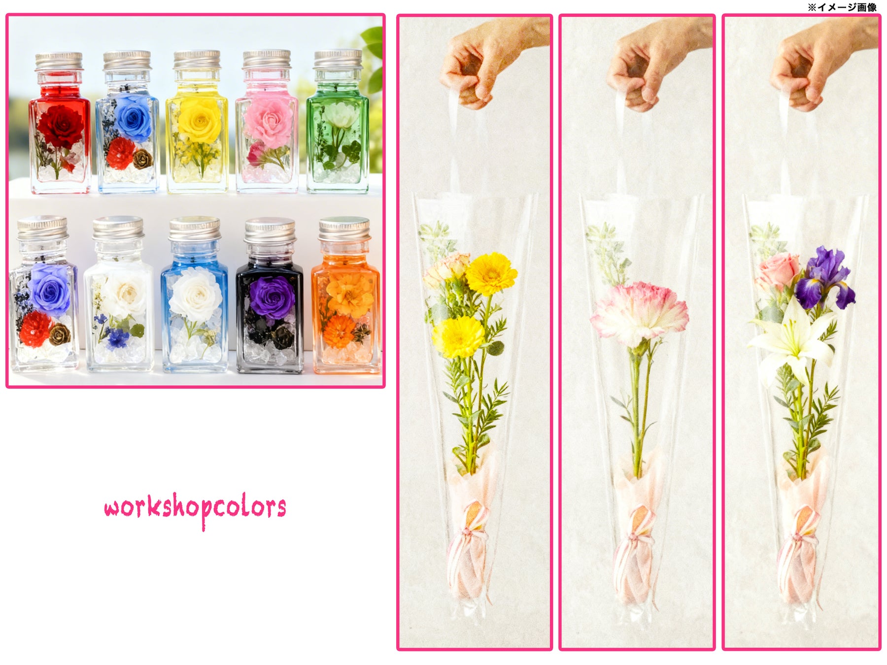 「フラワーロス」問題の解決に貢献。好きなお花をフラワーブーケバッグに入れて、世界に一つだけの花束を作ったり、推しの色のプリザーブドフラワーやドライフラワーをチョイスして、オイルと一緒に瓶に閉じ込めるインテリア雑貨「推し色フラワーボトル」をご用意。