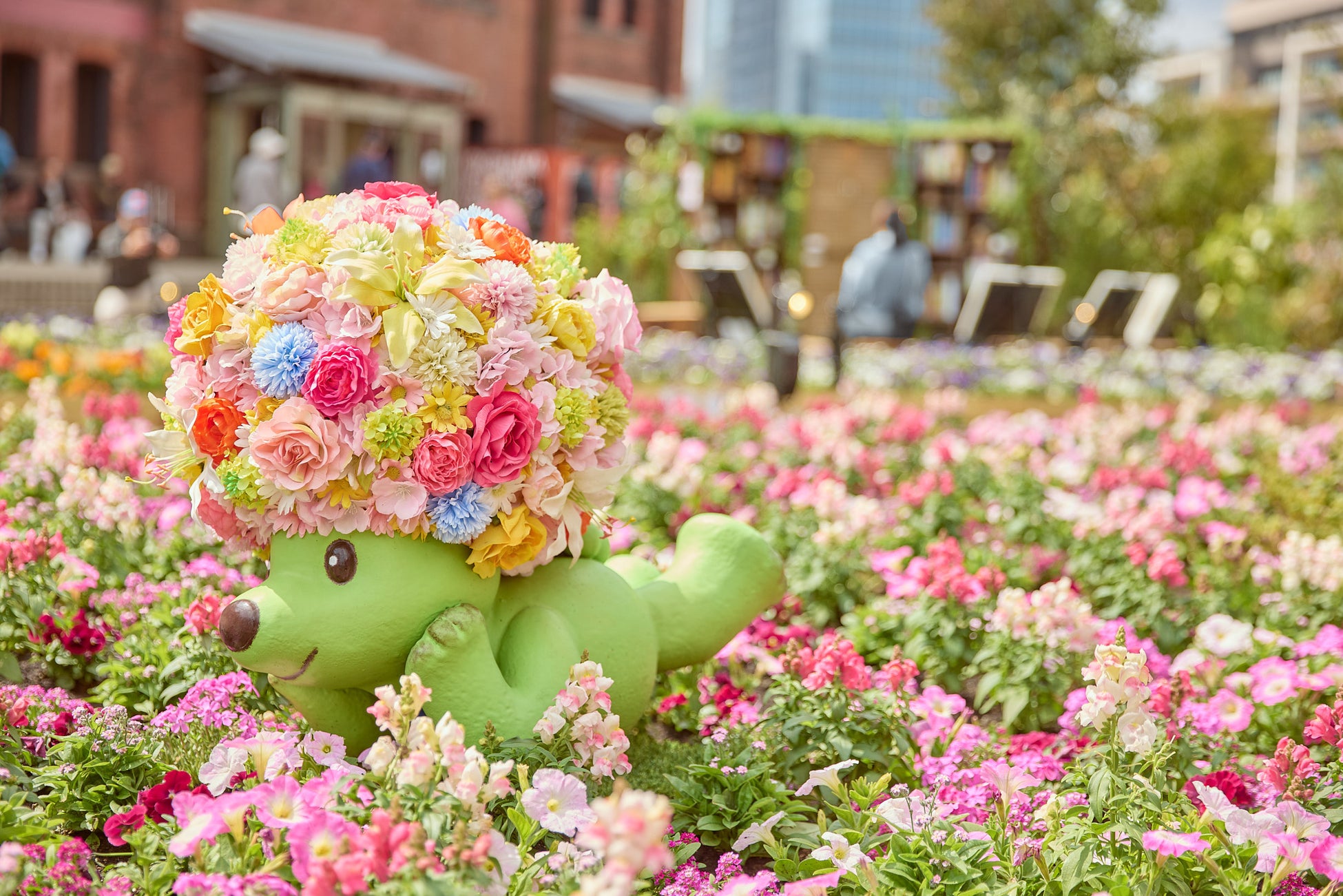 『FLOWER GARDEN 2026』では、連携施策として横浜赤レンガ倉庫のイベント会場内に、ガーデンネックレスのマスコットキャラクター「ガーデンベア」のオブジェが今年も登場します。訪れる皆様をお出迎えする会場入り口に、お馴染みオブジェに加え、イベントテーマ「Take a Break」にちなみ、「ガーデンベア」のリラックスしたレアな姿でも登場します。