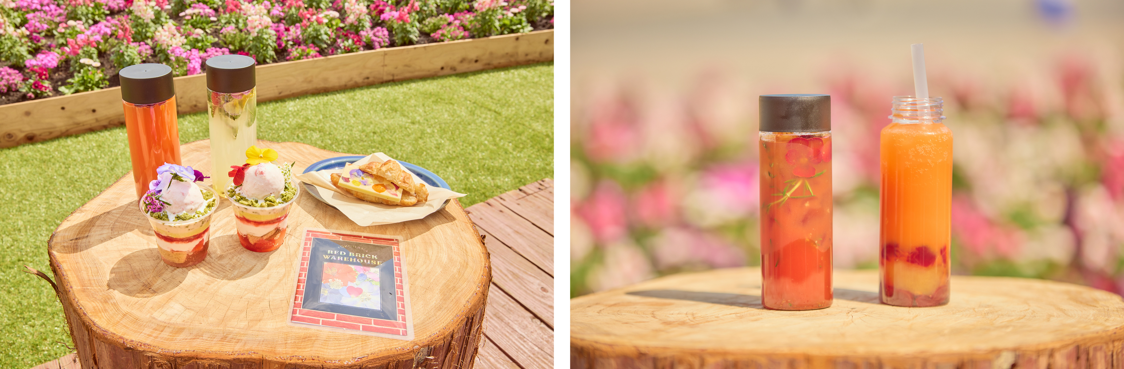 横浜赤レンガ倉庫 1・2 号館内のフードコートやカフェ・レストランでは、お花を眺めながらイベント会場でもお食事を楽しめるよう、特別なテイクアウトメニューが充実しています。フードコート内の一部エリアもお花の装飾で彩られ、食事の時間とともに春の雰囲気を満喫いただけます。「フラワーガーデンをモチーフにしたグルメが可愛い」「イベント目的だとなかなか館内に立ち寄る機会も少ないが、今回はイベントと連動したお花のメニューが気になり館内に寄った。お花畑と一緒に写真を撮ってInstagramに載せたい!」などと好評いただきました。