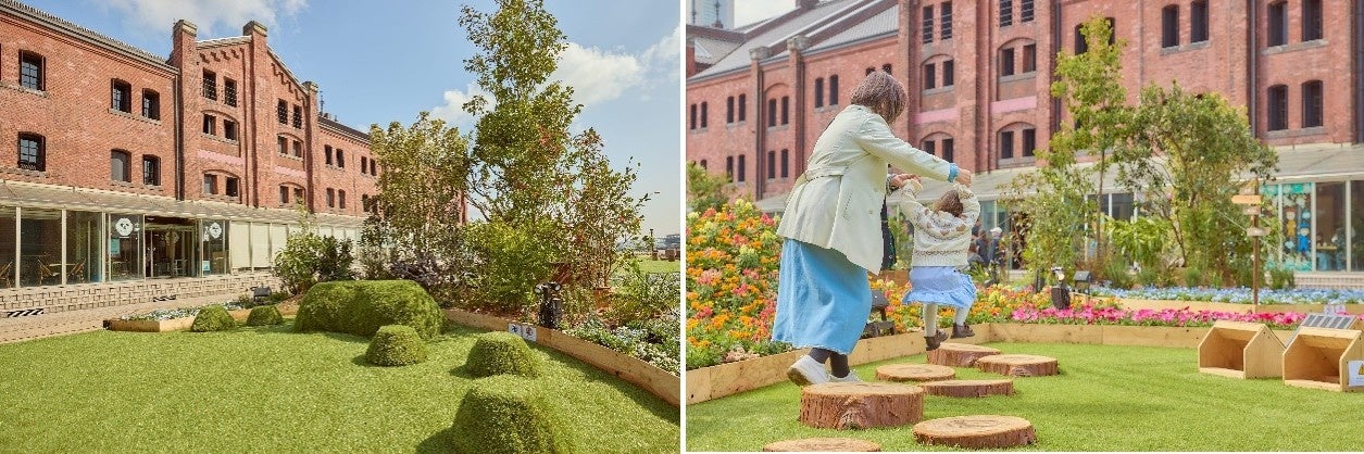 昼は、日の光に輝くカラフルな花々と、木製の遊具でお子様も遊べるプレイエリアが春の明るい雰囲気を際立たせます。夜は、花畑や横浜赤レンガ倉庫がライトアップされ、幻想的で美しい景色が広がります。“芝生で作られたベンチ”や、“大人も寝転べる丘”があるため、リラックスしながら、昼と夜でそれぞれ異なる表情をお楽しみいただけます。
