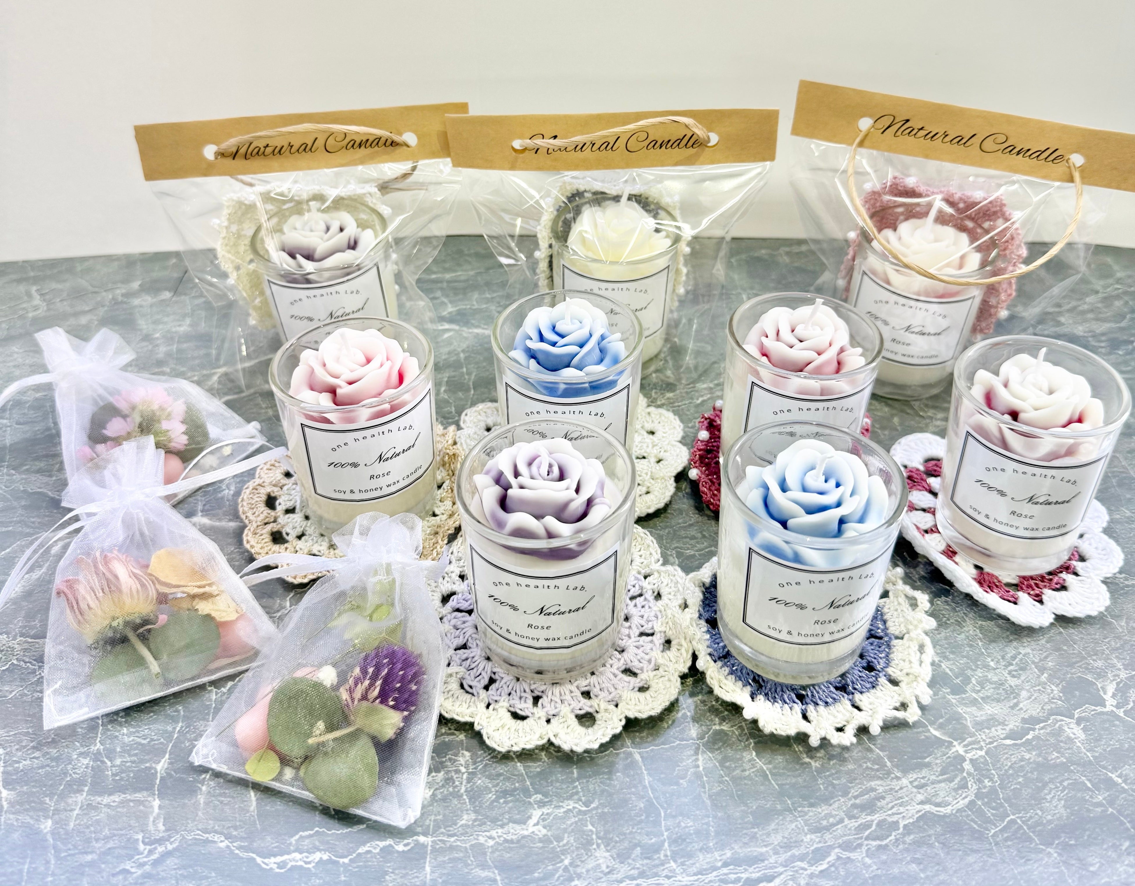 ミツロウと大豆ワックスで作られたローズキャンドル。天然精油の香りと自然素材の力で、空間と心に上質な癒しを届けます。