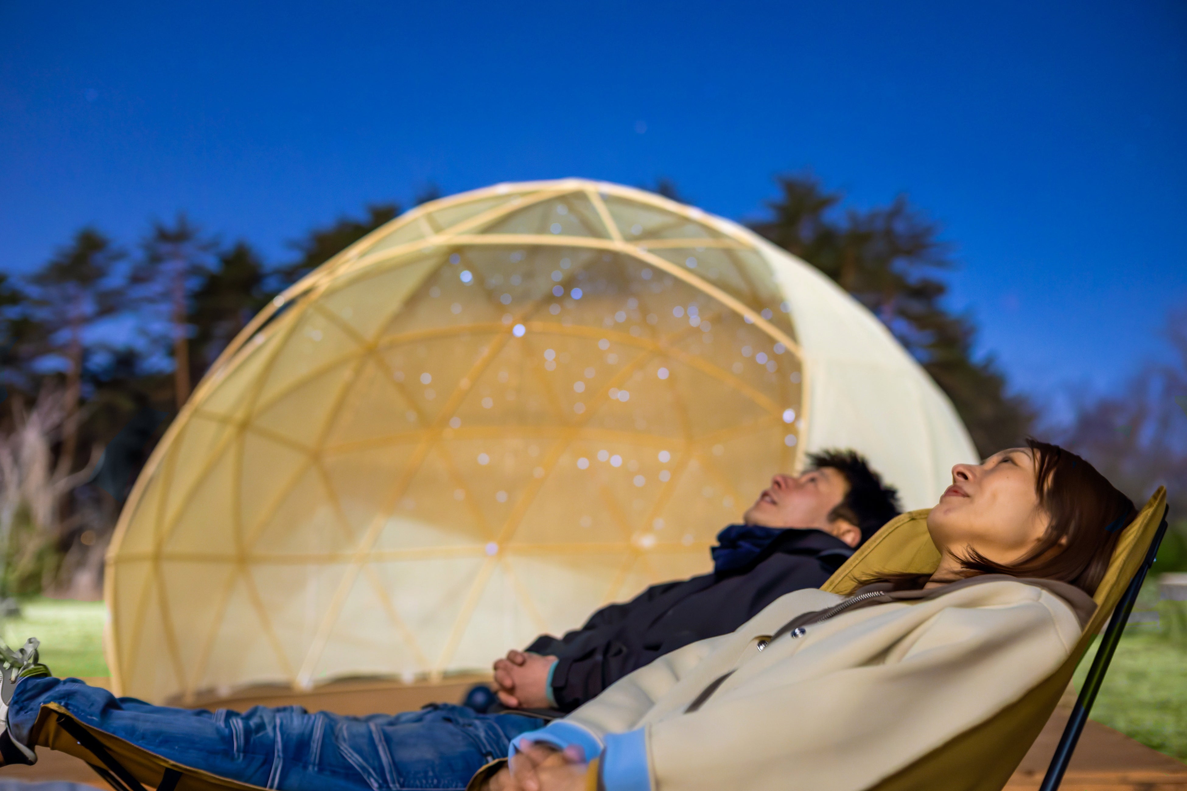 スターパークの象徴となる「ドームテント」では、天井に星座を投影し、プラネタリウムが楽しめる仕掛けを用意しました。天気の良い夜はテント上部を半開放し、本物の星を同時に楽しむことができます。また雨天や曇天で実際に星を見ることができない日でも、星座に親しむことができます。大人にとっては心落ち着く癒やしの時間、子どもたちにとっては宇宙や星への興味を育む学びの場となります。