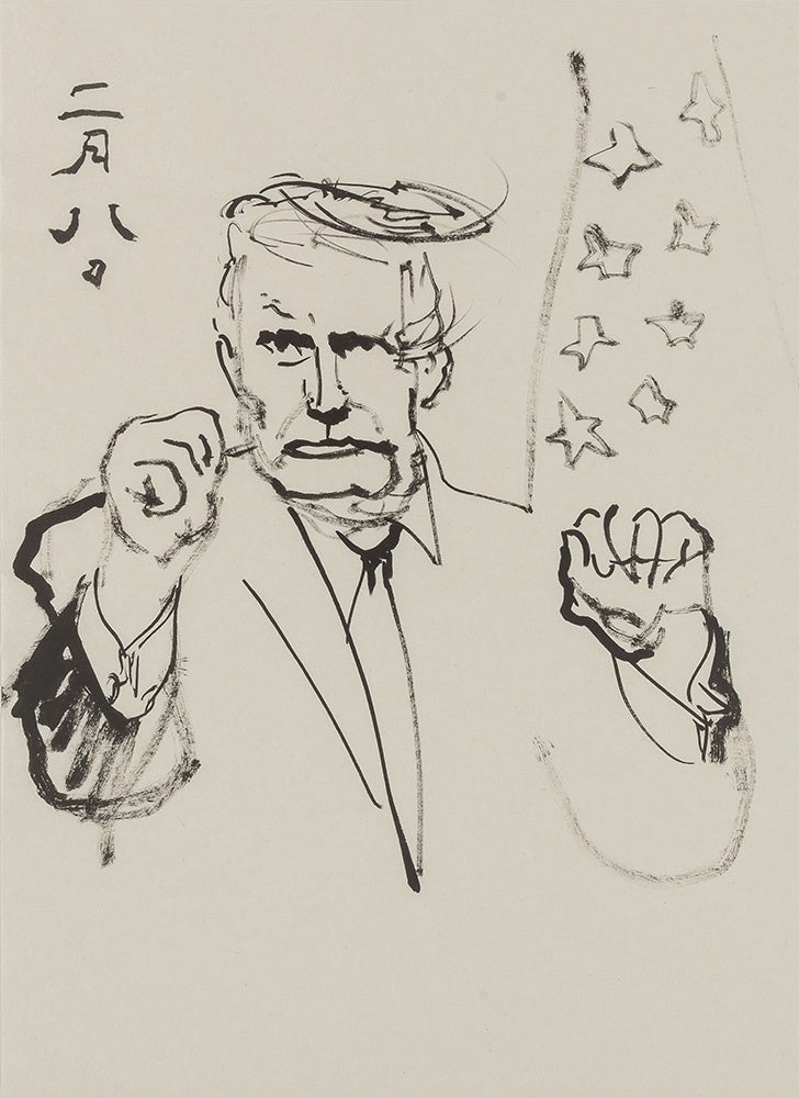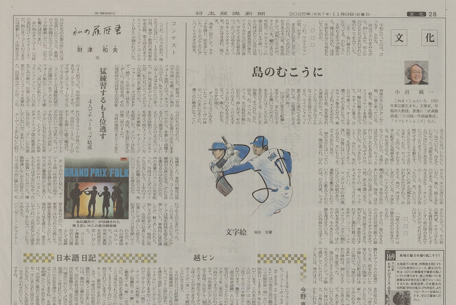 大谷翔平選手は、2025年11月に3年連続のMVPを受賞し、50本塁打&50奪三振という二刀流復活を象徴とするW記録も達成。この挿絵掲載の11月9日の時点でMVP受賞はほぼ確実と予想され、結果待ちの状態だったので、大谷の姿に「うつ」「なげる」の隠し文字を入れ、江戸時代から伝わる文字絵とした。北斎も文字と絵を融合させたユーモアあふれる遊び絵を制作していて、北斎にとって文字は形そのものが絵の骨格となる素材であり、文字を幾何学的パーツの集合体と捉えて読むものから見るものへと昇華させた点に新しさがあるように思う。技術的高さとユーモアが両立した江戸時代の粋を感じさせる魅力に、大谷への期待を重ねた。(コメント:福田美蘭)
