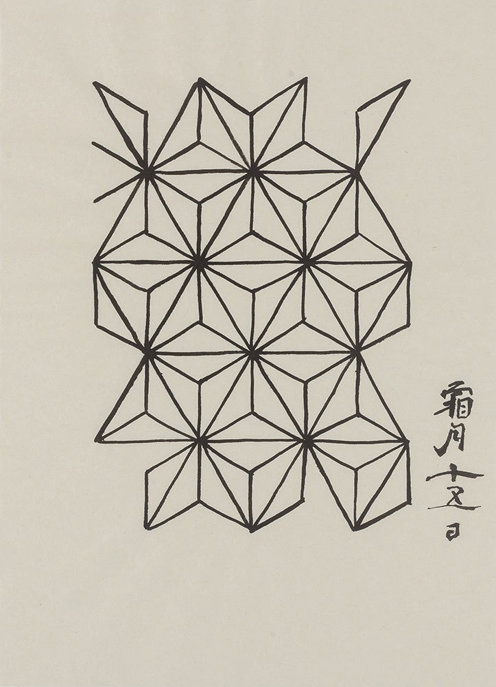 北斎の「冨嶽三十六景 五百らかん寺さざゐ」の構図には、視線を富士山に誘導するいくつもの仕掛けがあり(註1)、欄干はそれらの効果を生かすように画面に安定感を与え、又さざえ堂の上から富士山を眺める人々の日常の空間と、その先に拡がる霊峰富士が象徴する世界の境界として重要な役割を担っていると思うのだが、実際に作品を鑑賞する時には視界は富士山に強く引き込まれ、欄干にとどまることはない。この北斎の見えるということを自在にあやつる作画の工夫を面白いと思ったので、北斎の仕掛けにあやかり、ここでは欄干の中に2026の4つの数字が隠れているとして、人物を動かし数字を現わして2026年の年賀状の絵柄とした。(コメント:福田美蘭)