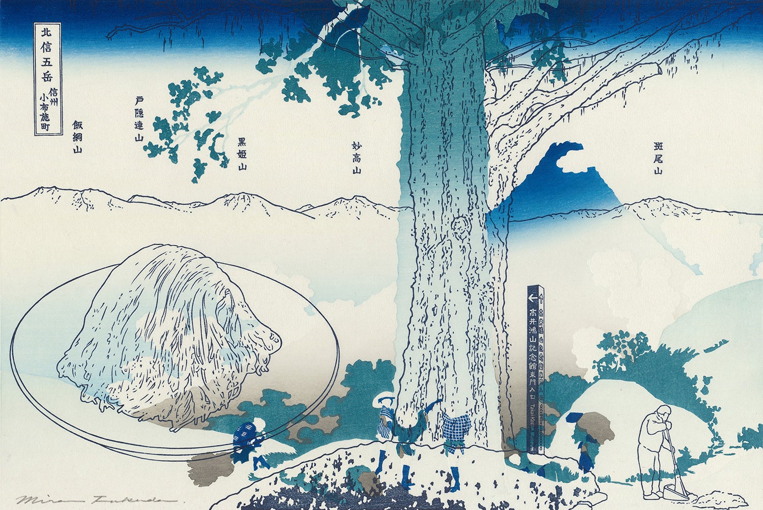 「冨嶽三十六景 甲州三嶌越」の背の高い巨木の存在感は、小布施町中心のシンボルツリーとして大きく枝を拡げ、来訪者を迎えるメタセコイアの印象と重なり、その後方にはこの町の高台から一望できる北信五岳の連なりを描く。富士山と同様に単独峰でありながら、五岳が揃って見える事は素晴らしいのだが、高さでは富士山に負けるので、それより高いモンブランの山として、秋の小布施堂の栗の点心「朱雀」を風景に組み込む。朱雀の美味しい季節には、毎日メタセコイアの大量の落ち葉を掃く人がいて、その人の背後の三角形と朱雀の形は北斎の画面に特有の相似形となった。(コメント:福田美蘭)