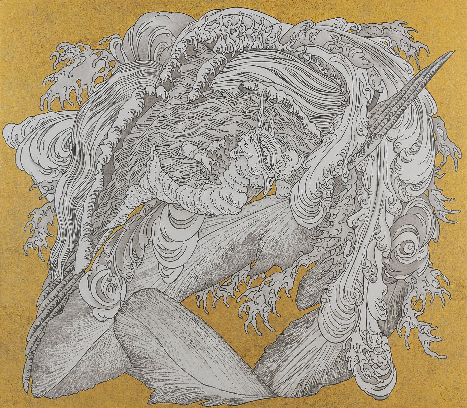 小布施上町の祭屋台の天井桐板に描かれた二図の渦巻を「近年「男浪」.「女浪」と俗称し、両図を「怒濤図」と呼んでいる」(註1)ことから、「怒濤」の意味の、激しい勢いのあるもの、勢いよく攻撃する様子を連想し、又「「怒濤図」の海底深く潜り込んでゆく渦巻には、波に宿る生命の根源に迫ろうとする北斎の執着が感じられる。」(註2)ということから二図を合体させて、女浪の中に男浪の波飛沫が潜り込んでゆくイメージをつくり、北斎の執着した生命の根源を具体的な形にしてみた。「制作当初どの向きで浪図が配置されていたのか判明しない…」(註3)ことも浪を再構成するプロセスを自由にしてくれて、北斎の波に手を加えることなくそのまま引用した。最初から図像の中に暗示されていたかたちから、近年の浪の俗称がついたと思われる。(コメント:福田美蘭)