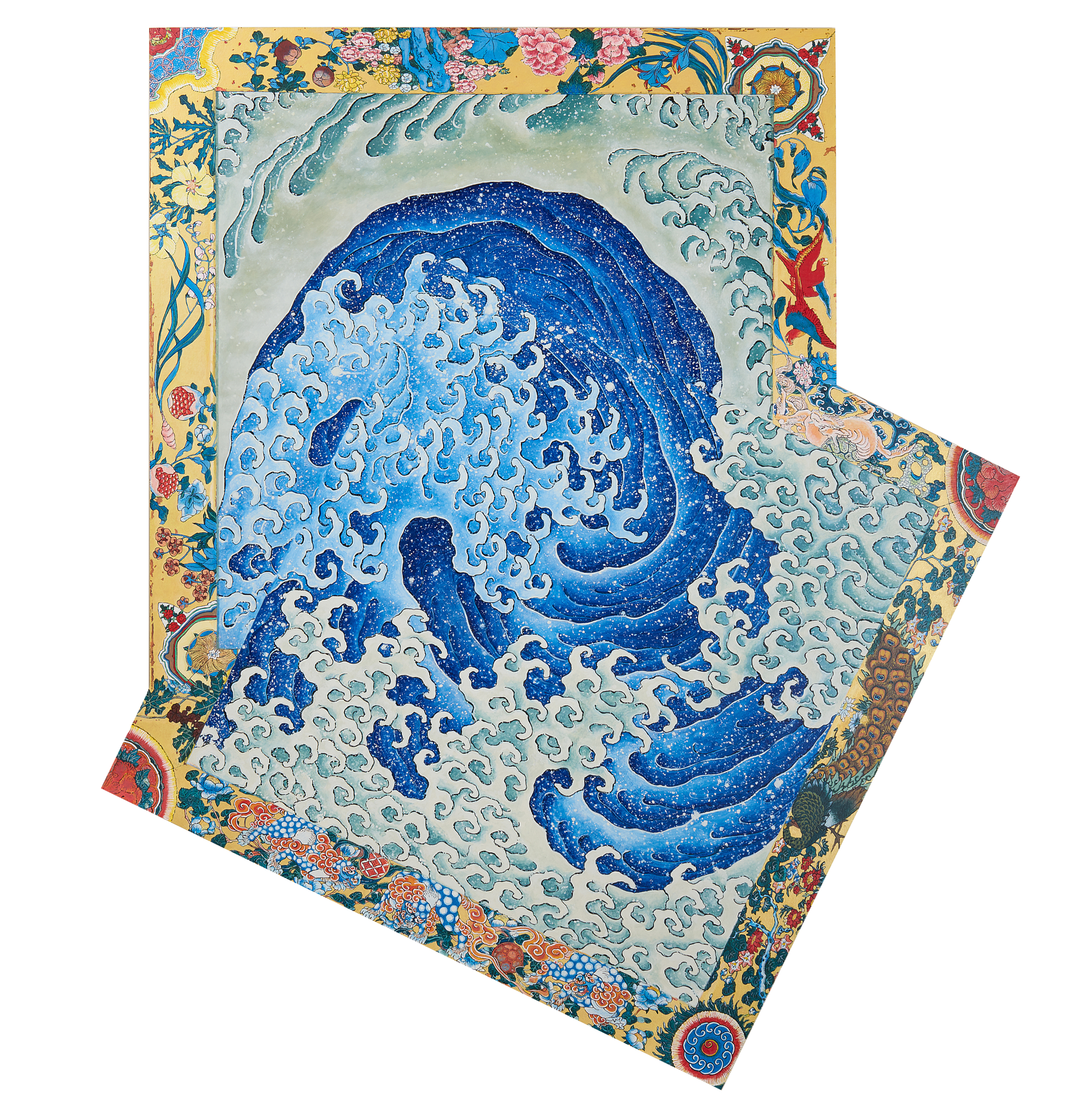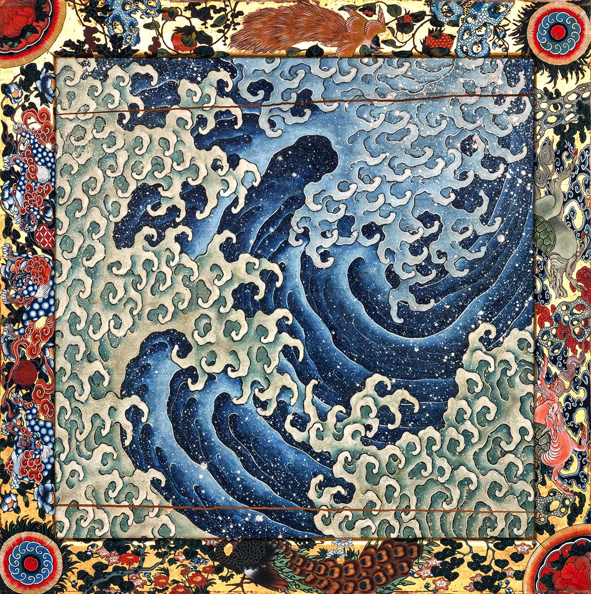 小布施上町の祭屋台の天井桐板に描かれた二図の渦巻を「近年「男浪」.「女浪」と俗称し、両図を「怒濤図」と呼んでいる」(註1)ことから、「怒濤」の意味の、激しい勢いのあるもの、勢いよく攻撃する様子を連想し、又「「怒濤図」の海底深く潜り込んでゆく渦巻には、波に宿る生命の根源に迫ろうとする北斎の執着が感じられる。」(註2)ということから二図を合体させて、女浪の中に男浪の波飛沫が潜り込んでゆくイメージをつくり、北斎の執着した生命の根源を具体的な形にしてみた。「制作当初どの向きで浪図が配置されていたのか判明しない…」(註3)ことも浪を再構成するプロセスを自由にしてくれて、北斎の波に手を加えることなくそのまま引用した。最初から図像の中に暗示されていたかたちから、近年の浪の俗称がついたと思われる。(コメント:福田美蘭)
