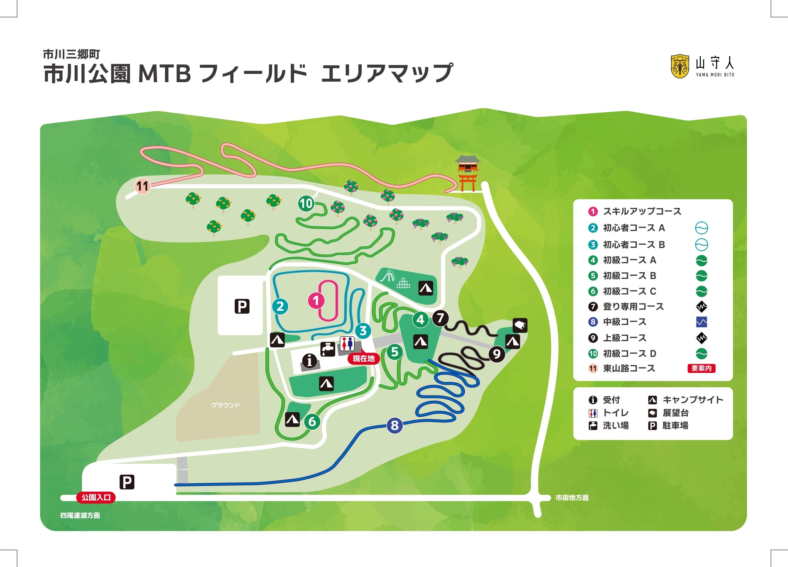 山梨県市川三郷町の市川公園MTBフィールドはリニューアルオープンから1年半を迎え、さらに新コース2本が追加されたため、公園エリアマップを新たに作成致しました。