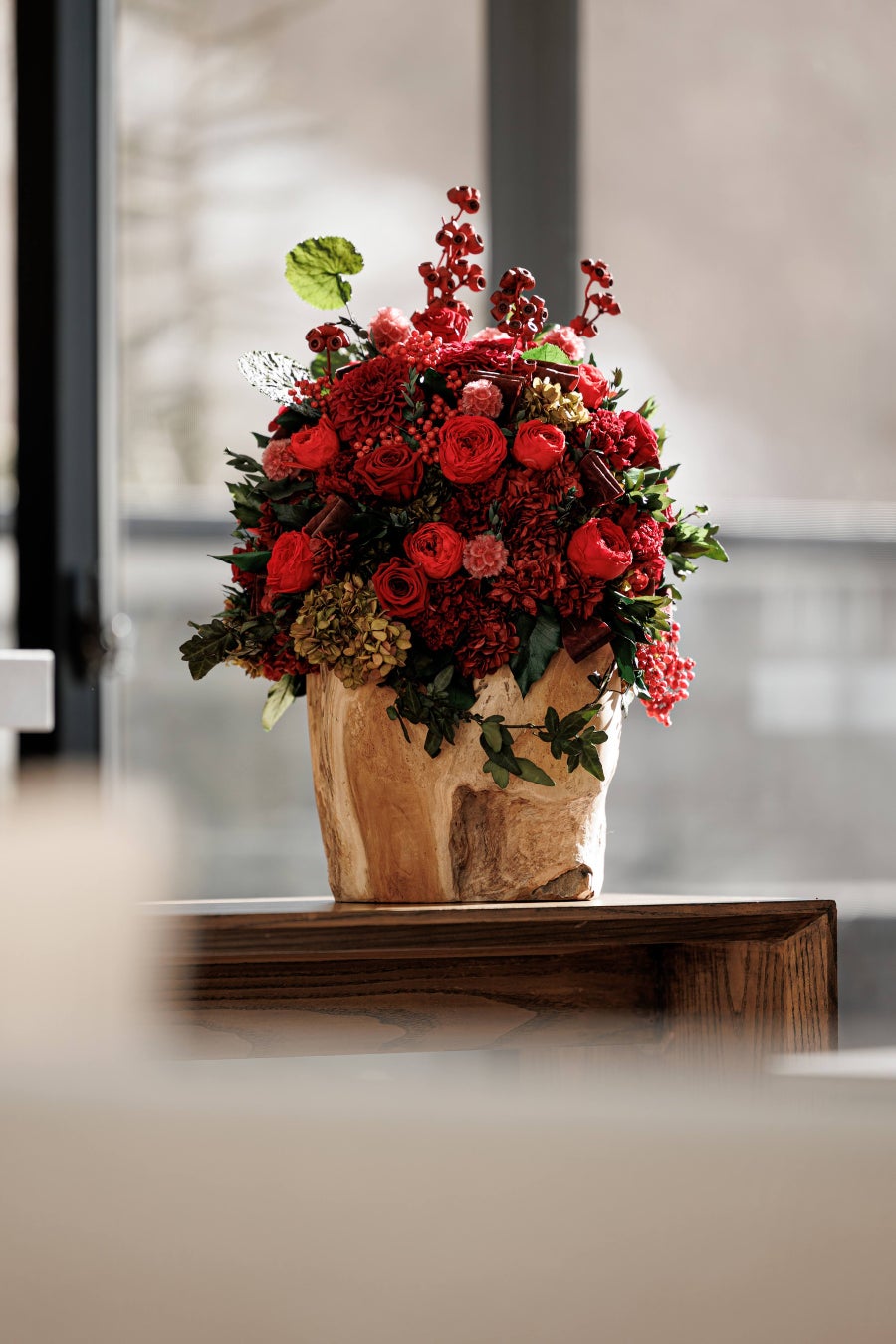 雄大な自然に抱かれたあさま空山望の美しさに呼応するように、力強い枝物や温もりのある木の器など、自然の素材が持つ生命力を贅沢に活かしたフラワーアイテムを揃えました。ラグジュアリーな空間をいっそう引き立てるようなカラーグラデーションや、選び抜かれた花材が織りなす特別なフラワーデザインに仕上げました。あさま空山望で過ごすひとときが、より彩り豊かに、そして心に深く刻まれるようになればと思います。