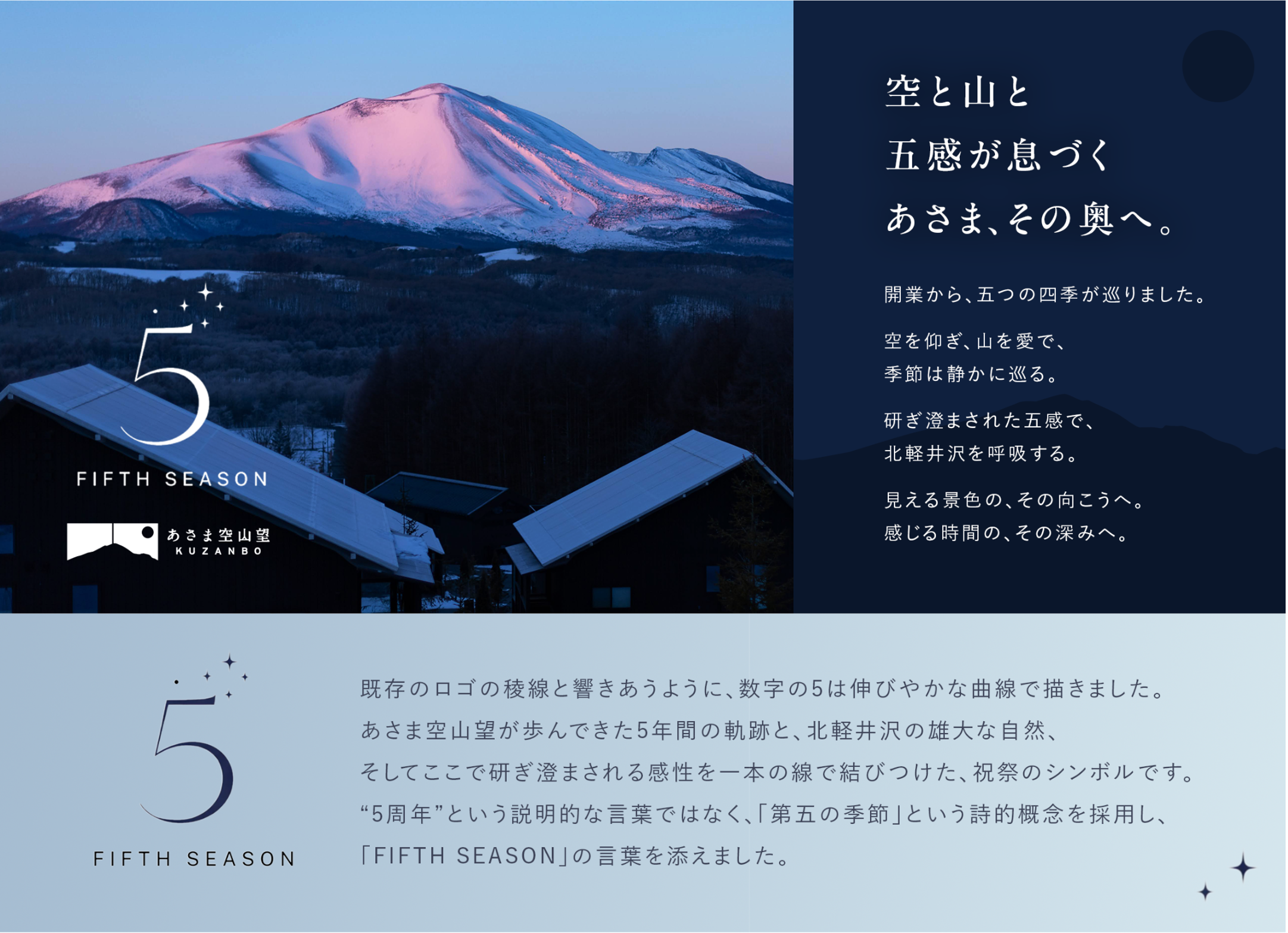 あさま空山望は2026年4月26日(日)に開業5周年を迎えます。アニバーサリーイヤーのコンセプトとして、「空と山と、五感が、息づくあさま、その奥へ。」を掲げました。1年を通し、北軽井沢の自然や季節を五感で楽しむ体験をお届けしてまいります。ぜひご期待ください。