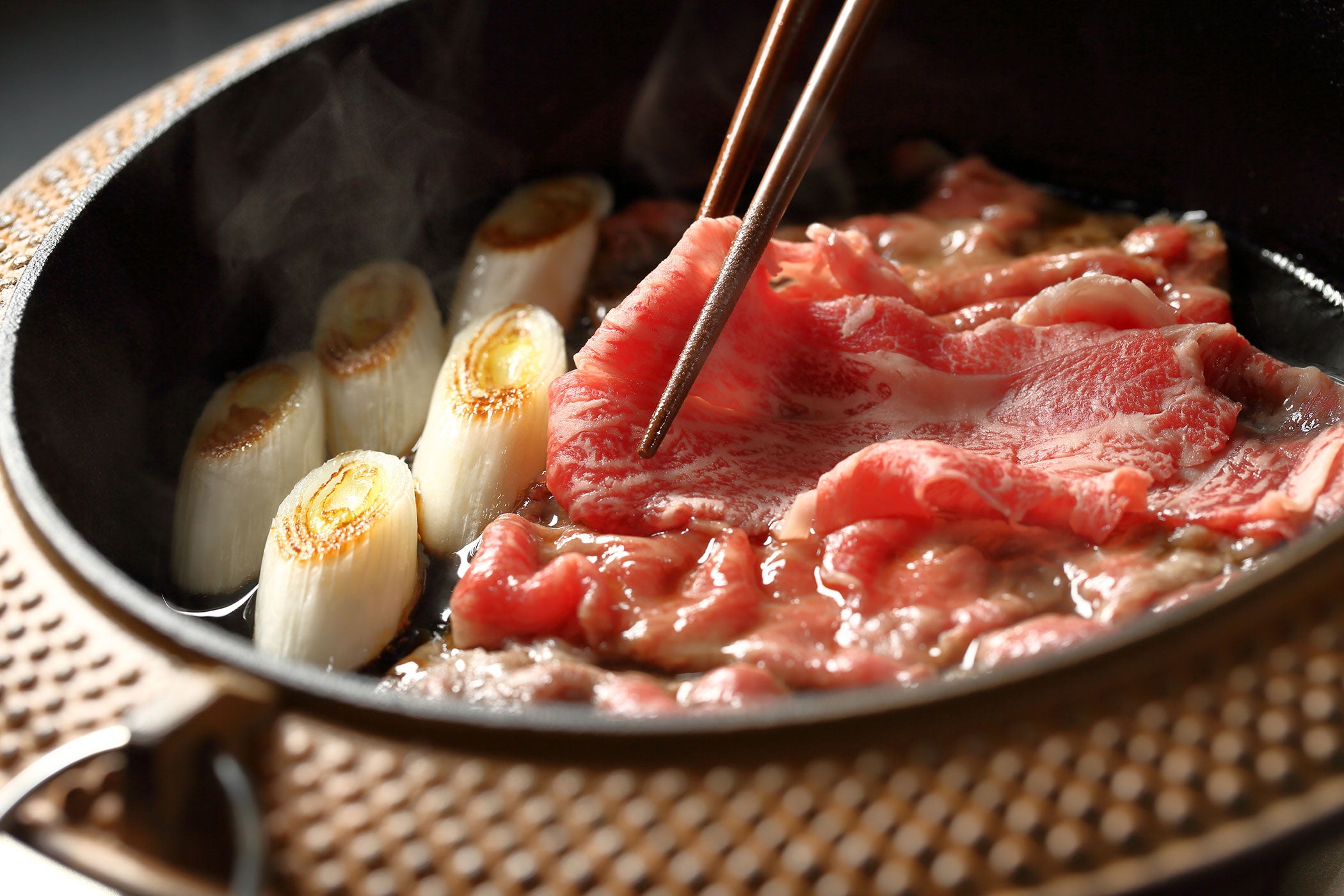 左)黒毛和牛ロースを使用した焼きすきは、まさにご馳走にふさわしい一品。口のなかでとろける美味しさをお楽しみください。