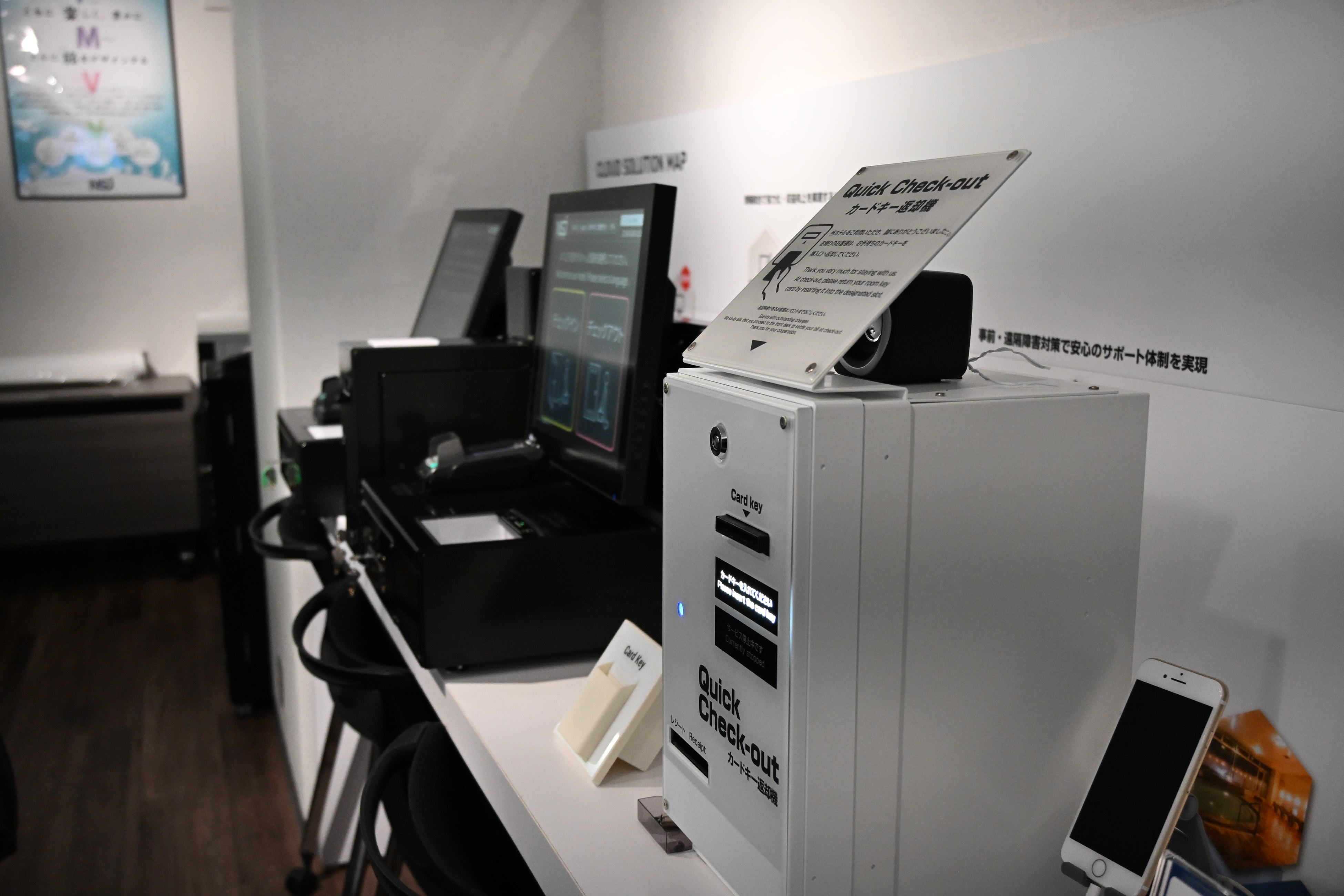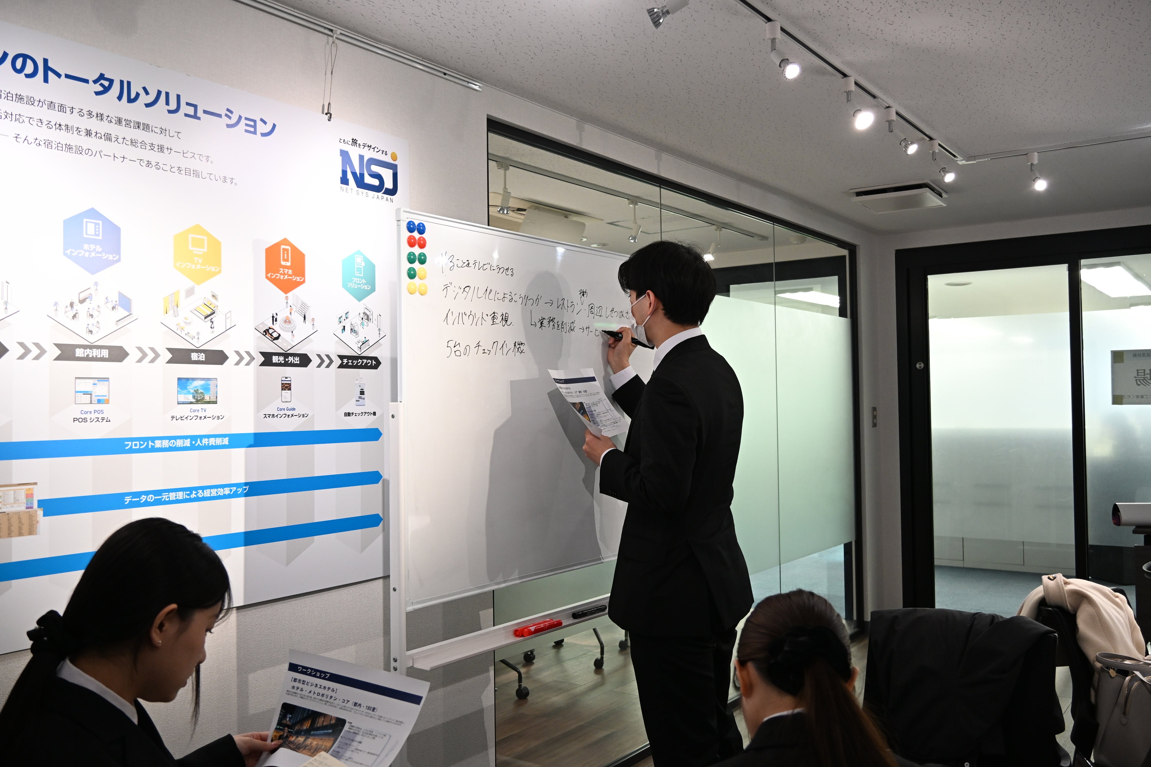 観光業の現状や課題について解説した後、当社のトータルソリューションの一部であるシステムや機器を使用し、チェックイン・入退室・チェックアウトといった一連の流れを疑似体験していただきました。
