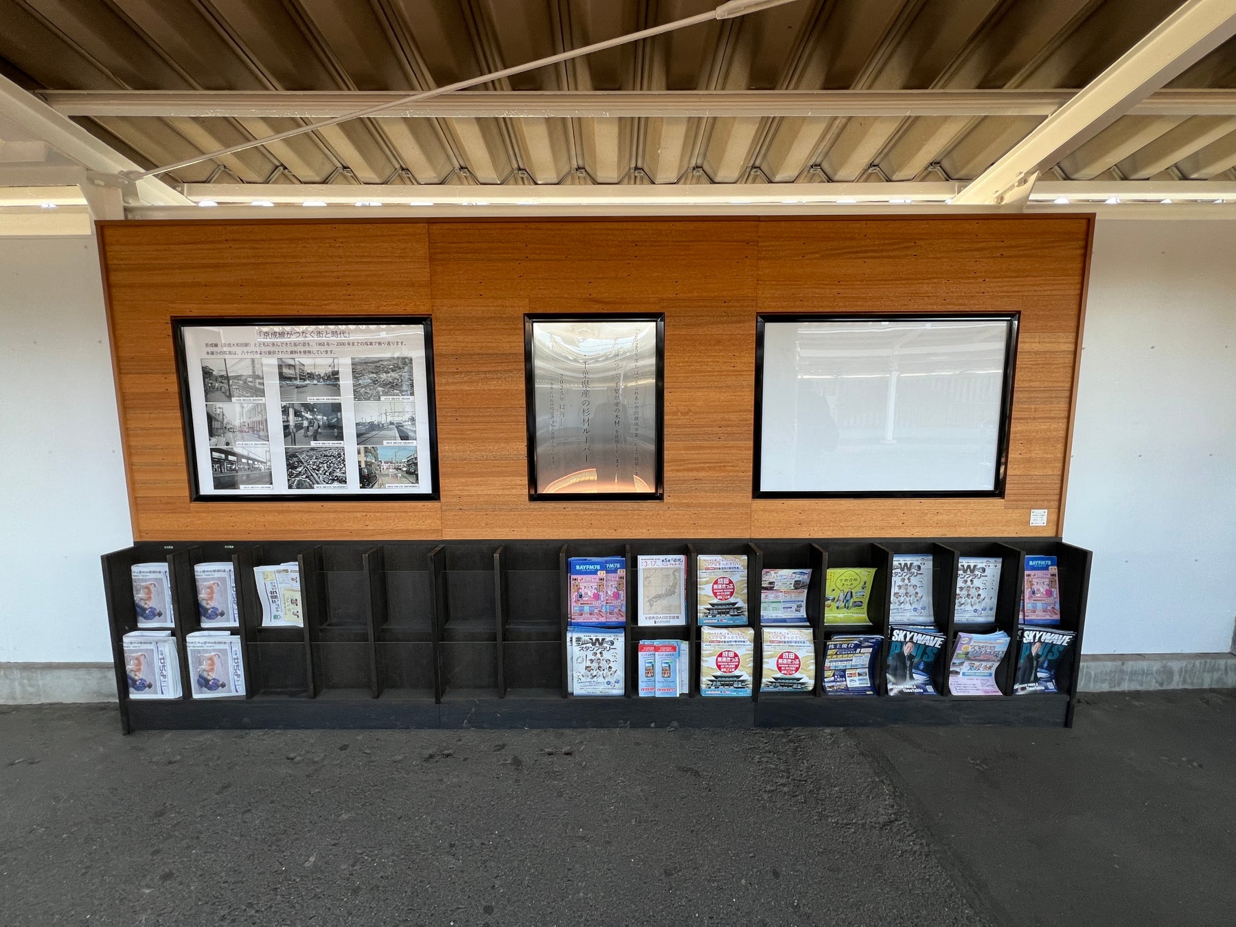 SDGsの観点から、上りホーム壁面に設置したアクセントボードに、古材(2025年度より実施している大佐倉駅バリアフリー化工事に伴い解体した木製ベンチ)を再利用しました。