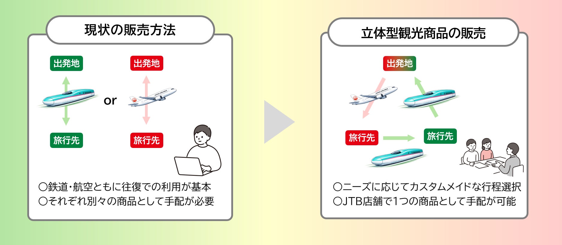 首都圏のお客さまの移動体験や周遊意向など多様なニーズを検証するため、2026年4月から9月の間、JTBの首都圏※3店舗で首都圏発~東日本エリア着の商品を「鉄道+航空」の立体観光型にカスタマイズして販売します。お客さまのニーズに応じて、往路・復路で鉄道または航空を選ぶことができます。また、商品をおトクに購入できる旅行クーポンの配布キャンペーンも実施します。適用要件など、詳細はJTBの対象店舗にてご確認ください。