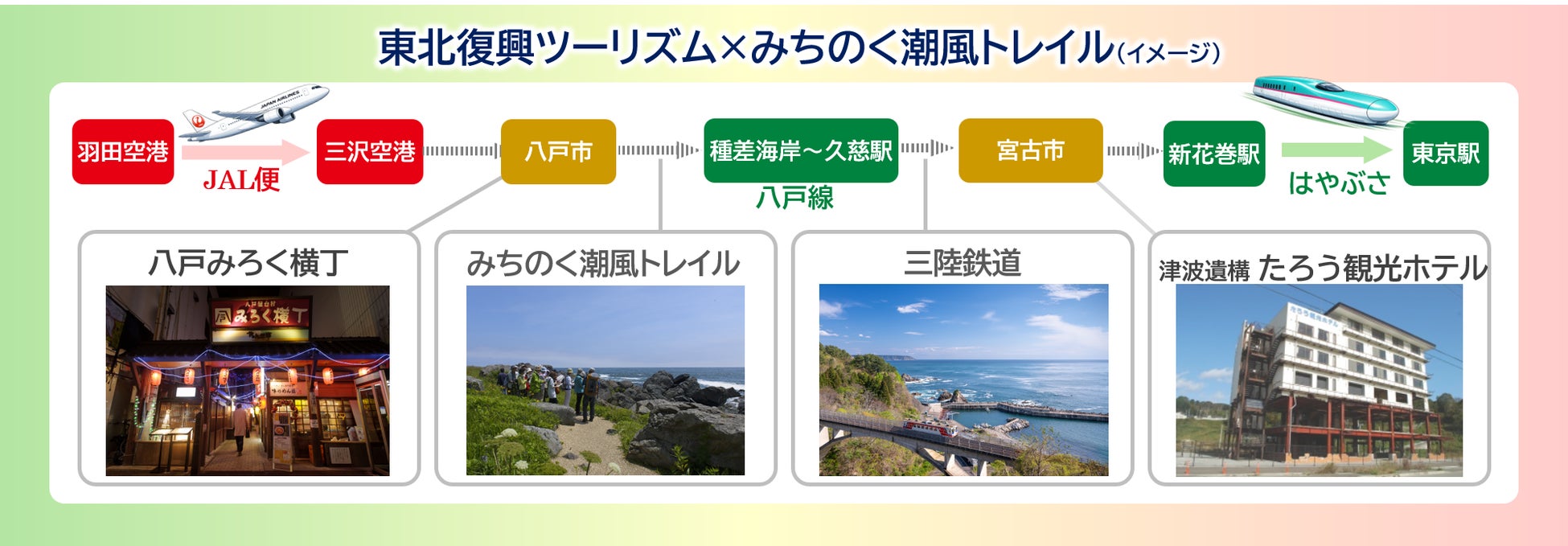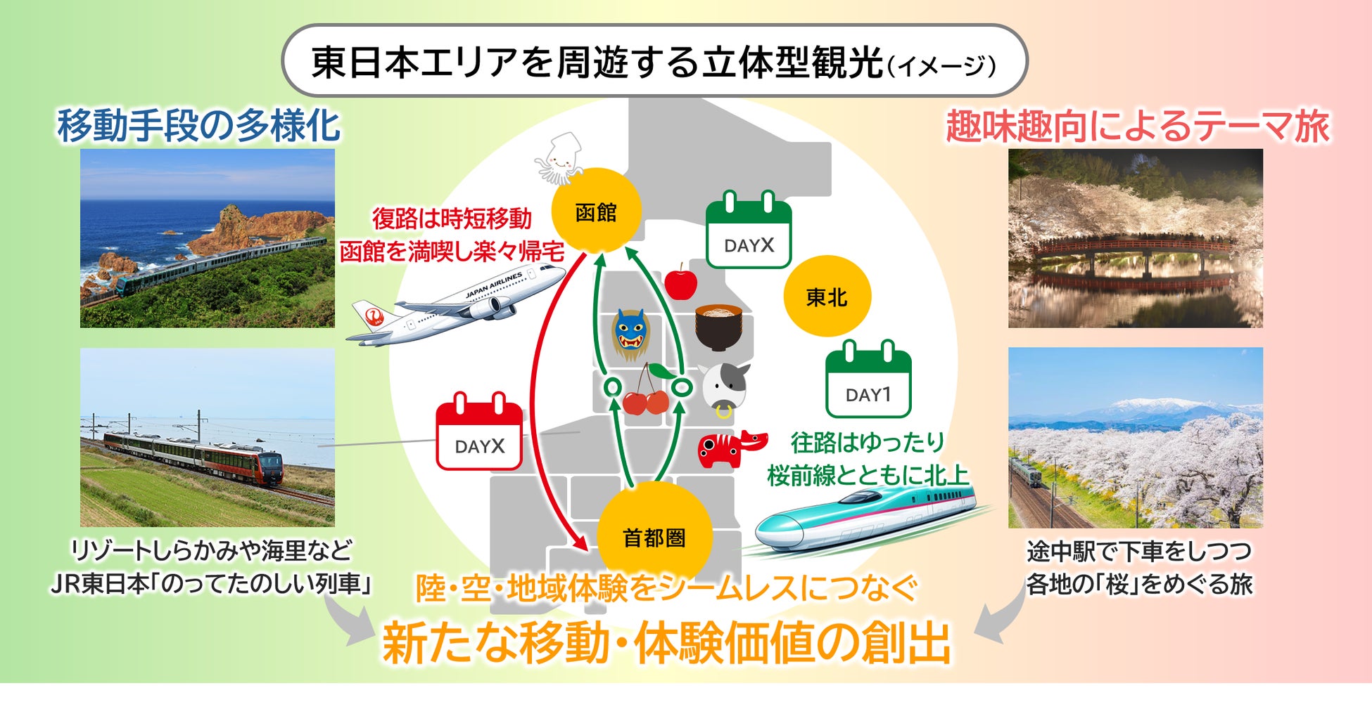 (1)3社の鉄道・航空・交流創造力というそれぞれの強みとネットワークを結集し、東北をはじめとする東日本エリアで広域的な周遊を促進する新たな観光モデルの確立を目指します。陸・空・地域体験をシームレスにつなぐことで、「新たな移動・体験価値」を創出します。
