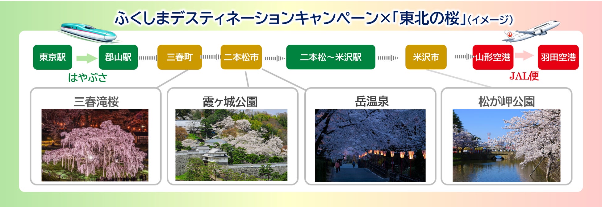 東日本大震災から15年という節目に開催するJRグループデスティネーションキャンペーン「しあわせの風ふくしま※4」やJTBグループ国内旅行キャンペーン「日本の旬※5東北」との連携により、東北エリアへの誘客促進と広域周遊の拡大を図ります。
