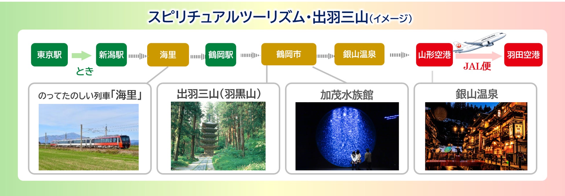 ○東日本旅客鉄道株式会社(本社:東京都渋谷区、代表取締役社長:喜㔟 陽一、以下「JR東日本」)と日本航空株式会社(本社:東京都品川区、代表取締役社長:鳥取 三津子、以下「JAL」)と株式会社JTB(本社:東京都品川区、代表取締役 社長執行役員:山北 栄二郎、以下「JTB」)は、3社の連携により東日本エリアの立体型観光※1を推進します。