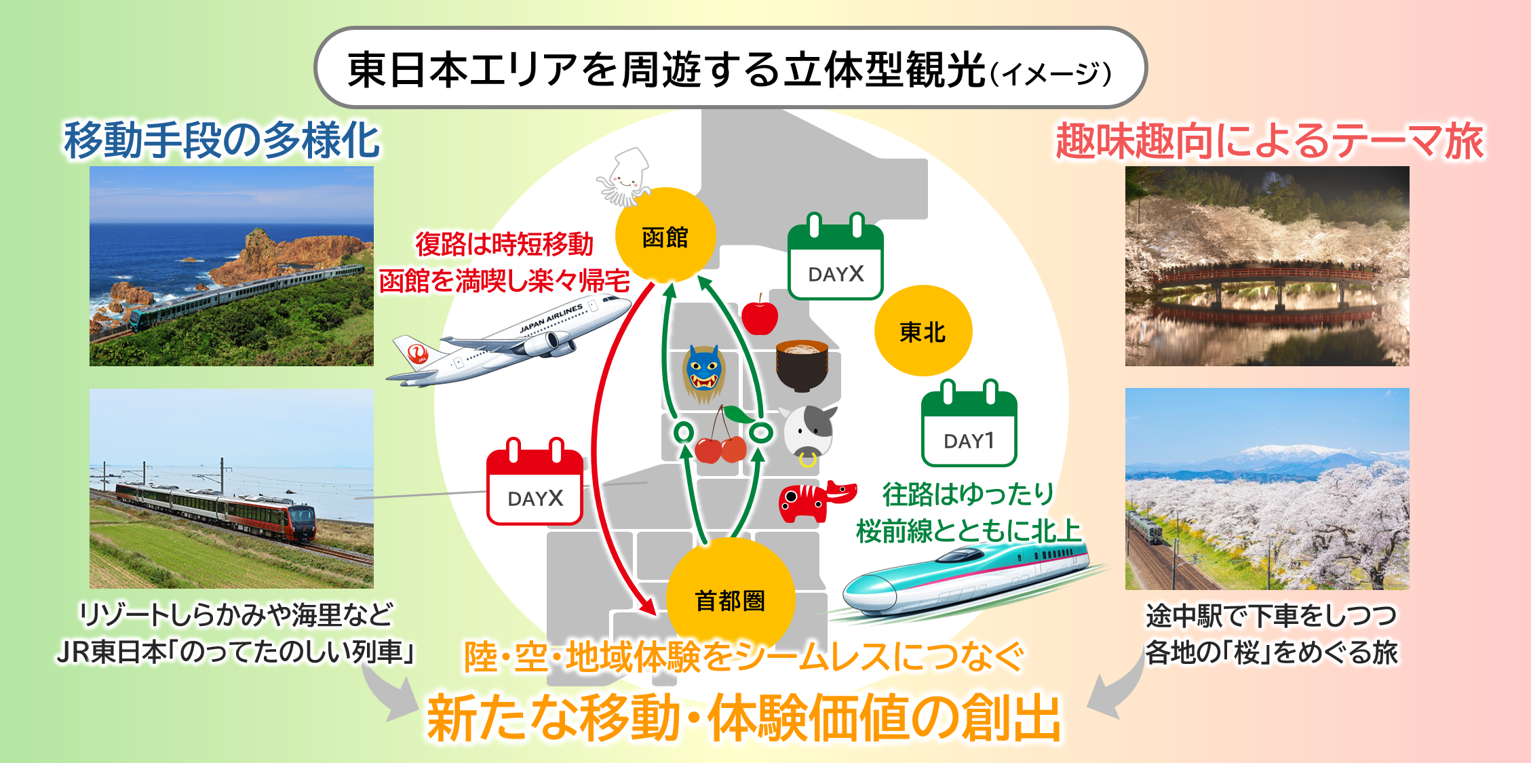 (1)3社の鉄道・航空・交流創造力というそれぞれの強みとネットワークを結集し、東北をはじめとする東日本エリアで広域的な周遊を促進する新たな観光モデルの確立を目指します。陸・空・地域体験をシームレスにつなぐことで、「新たな移動・体験価値」を創出します。