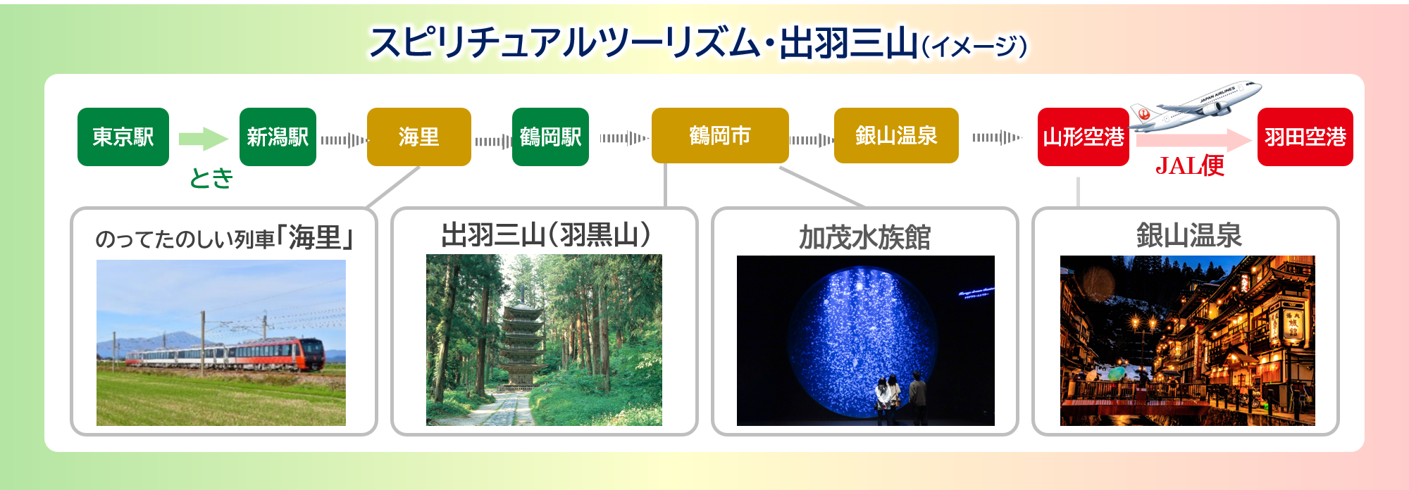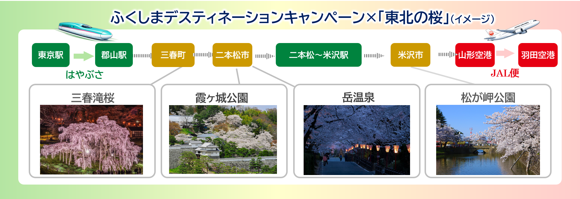 東日本大震災から15年という節目に開催するJRグループデスティネーションキャンペーン「しあわせの風ふくしま※4」やJTBグループ国内旅行キャンペーン「日本の旬※5東北」との連携により、東北エリアへの誘客促進と広域周遊の拡大を図ります。