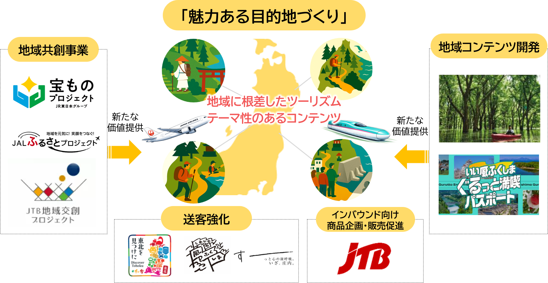 地域に根差したツーリズムやテーマ性を持った観光コンテンツとの連携や、JTBが持つ「交流を創造する力」を活かしたコンテンツ開発、また各社の地域共創の取り組みを通じて開発したコンテンツの活用を進めます。そして、国内観光キャンペーンや海外ネットワークを活用した情報発信を通じて、東日本エリアの魅力を国内外に広く発信し、誘客促進を図ります。また、開発したコンテンツを組み込んだインバウンド向け商品の企画・提案により、訪日誘客の強化を図ります。