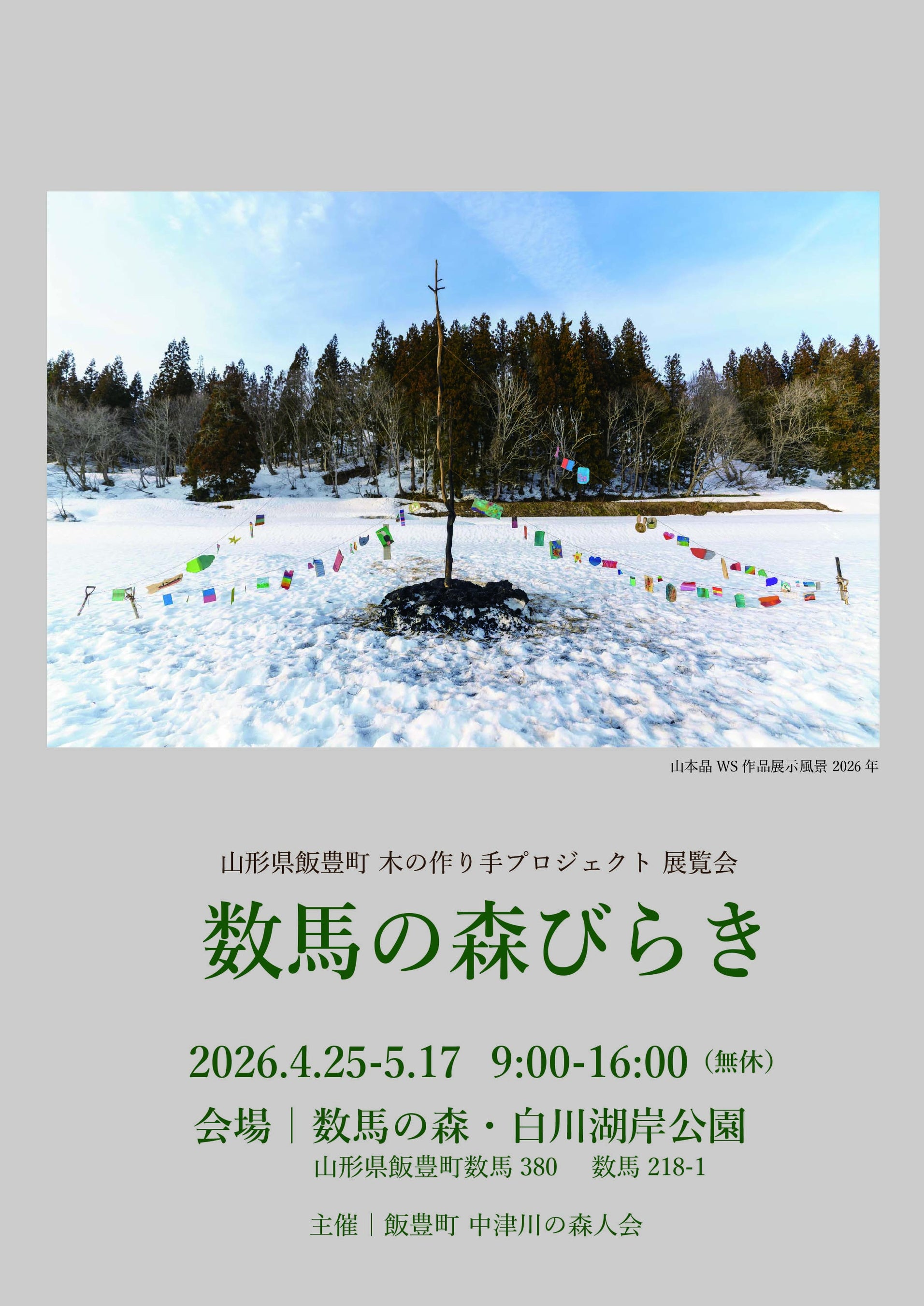 特別豪雪地帯・山形県飯豊町の中津川地区に滞在して住民と交流しながら、豊富にある広葉樹を活用して制作や造形活動を行うアーティスト・イン・レジデンス「飯豊町 木の作り手プロジェクト」。この2025年度のプログラムに参加した2人のアーティスト宮原嵩広さん(彫刻家)と山本 晶さん(画家)が新作を披露。加えて過去に当地で制作された作品も展示し、23日間にわたって展覧会「数馬の森びらき」を開催します。