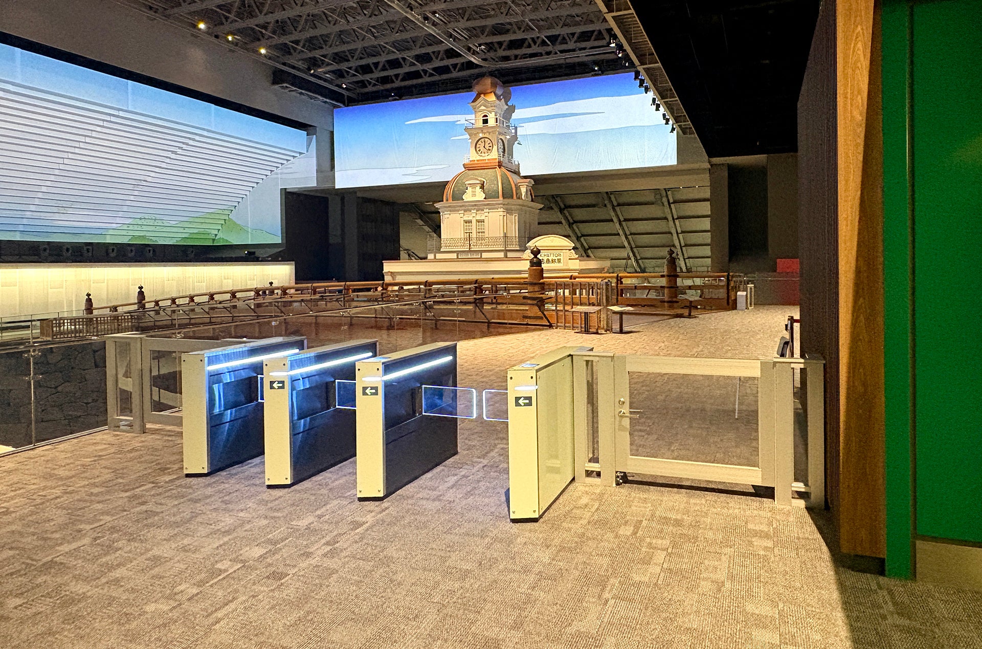 6F常設展示室入口に新たに設置された入場ゲート。明治時代を象徴する「服部時計店」の原寸大模型がある空間への入口となり、QRコードが印刷されたチケットをゲートの読み取り部にかざすとダイレクト入場ができる